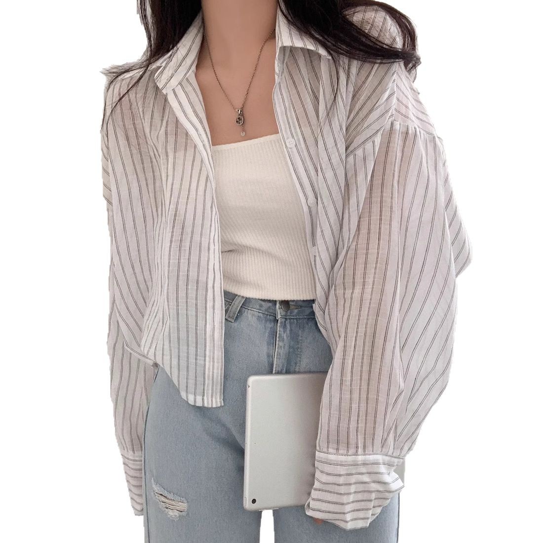 Главная страница > Корейский chic ленивый ветер свободная дикая легкая солнцезащитная рубашка с длинными рукавами короткая ретро полосатая рубашка