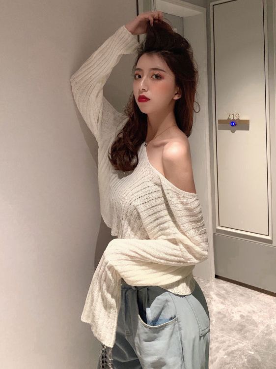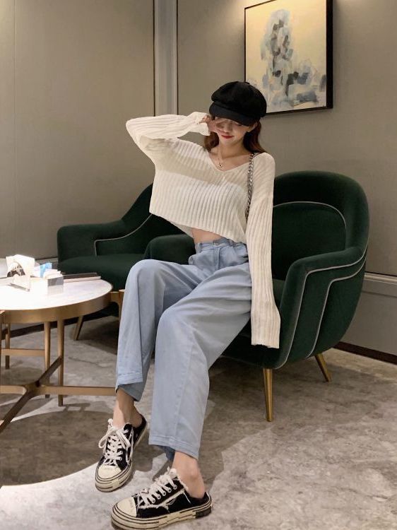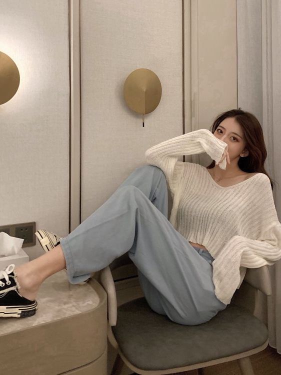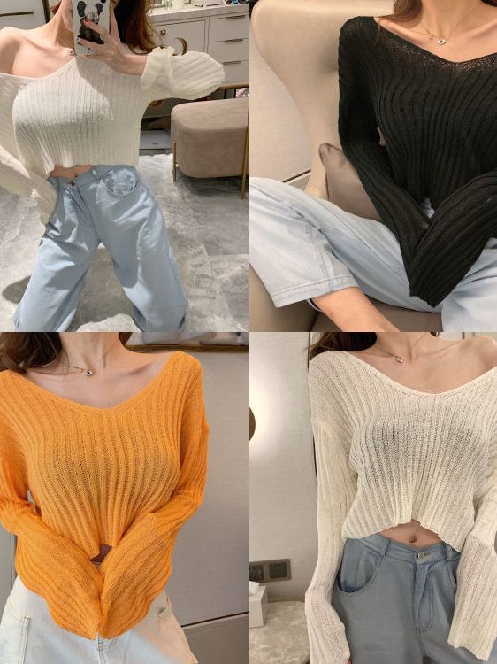 Главная страница > Футболка с ключицей Свободная вязаная Базовая рубашка с V-образным вырезом, Женская ленивая короткая Укороченная рубашка с длинными рукавами в гонконгском стиле, тонкая весенняя одежда