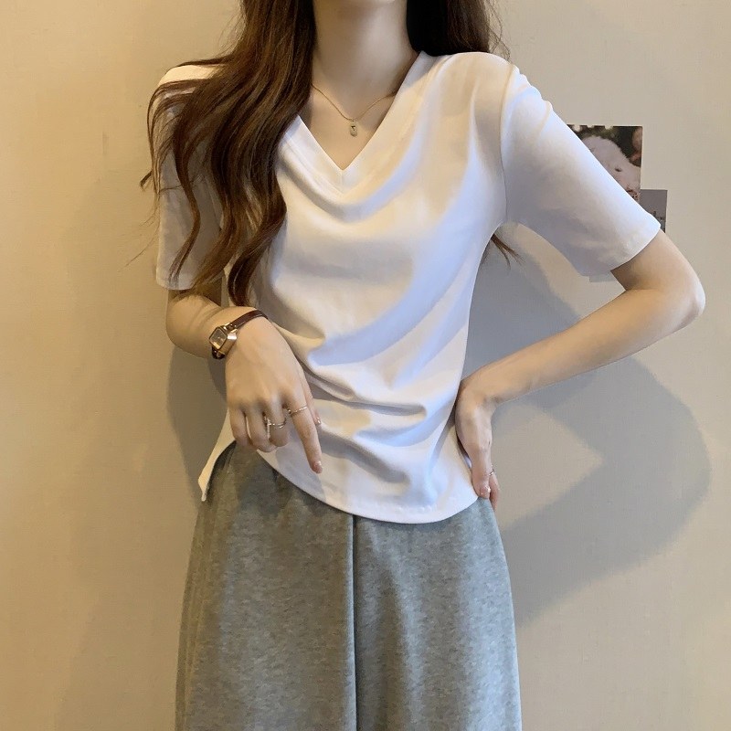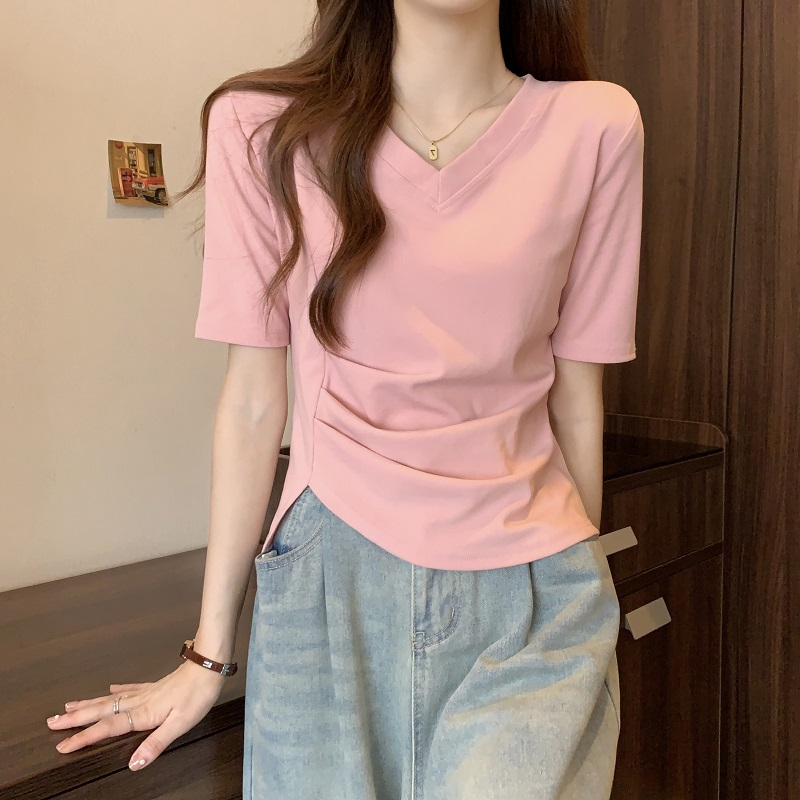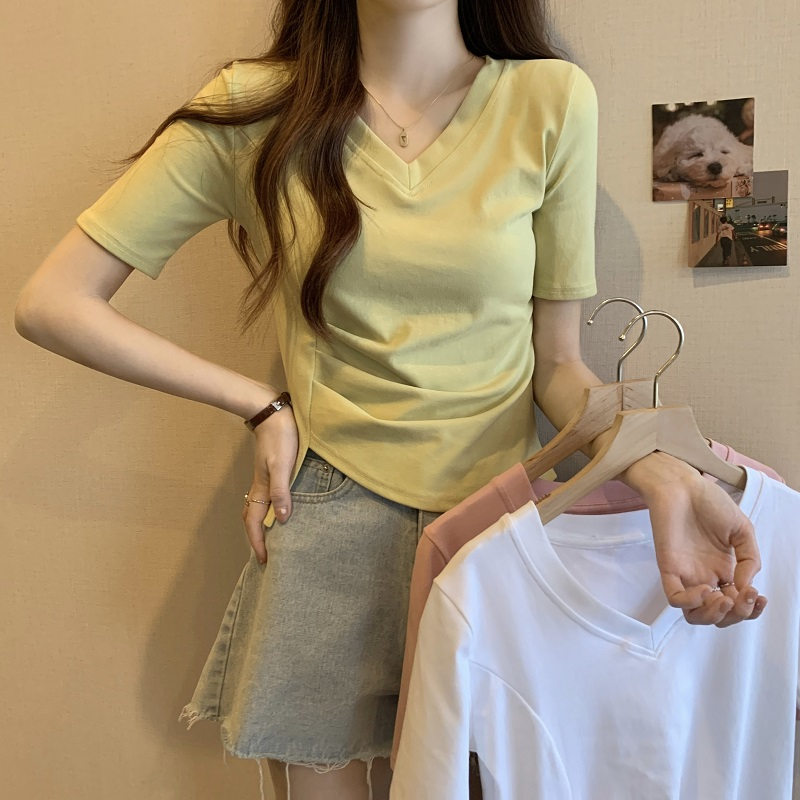 Лето 2025 новый v-образный вырез тонкая короткая горячая девушка футболка с короткими рукавами женская рубашка с короткими рукавами