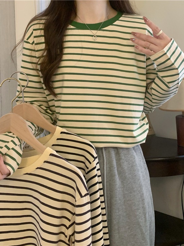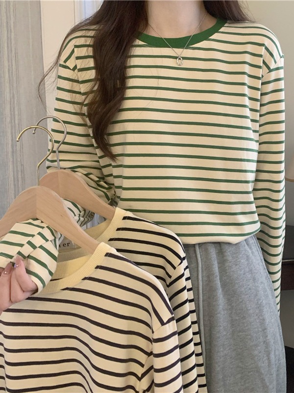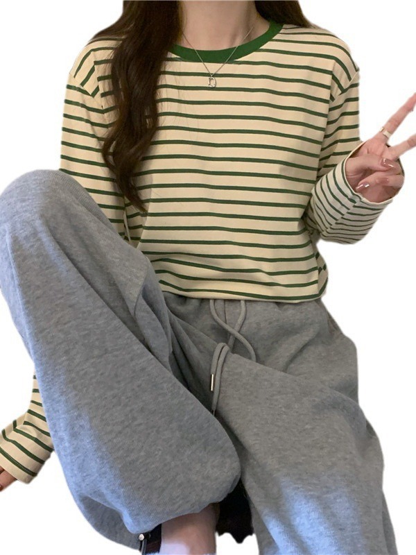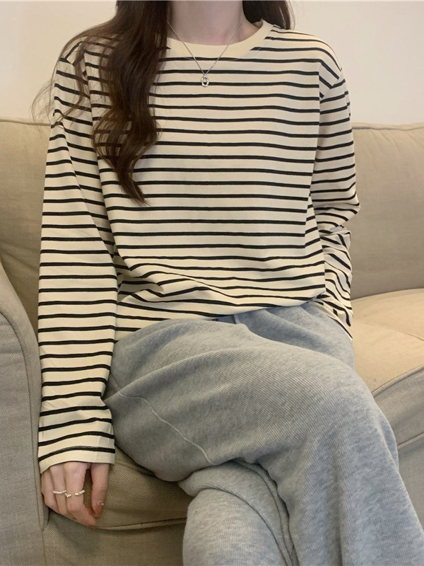 Главная страница > В наличии 2024 Ранняя весна новая свободная универсальная облегающая черно-белая полосатая нижняя рубашка тонкая футболка с круглым вырезом и длинным рукавом для женщин