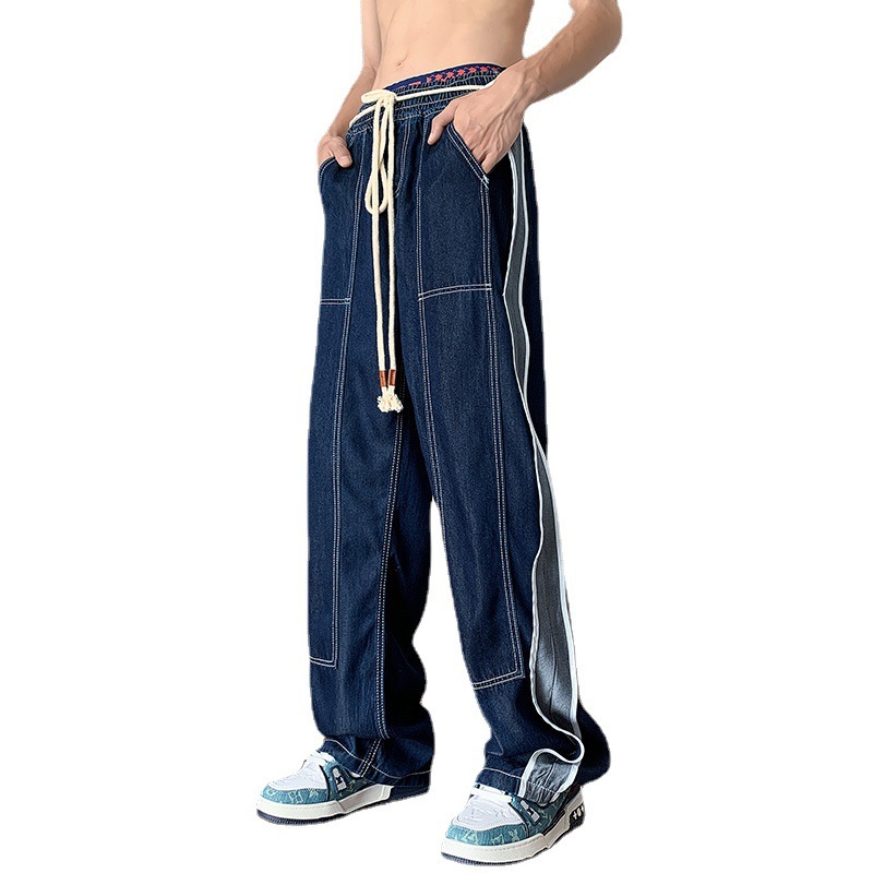 Главная страница > Выстиранные джинсы в американском стиле с застежкой на завязках для подростков, мужские свободные прямые широкие брюки в американском стиле