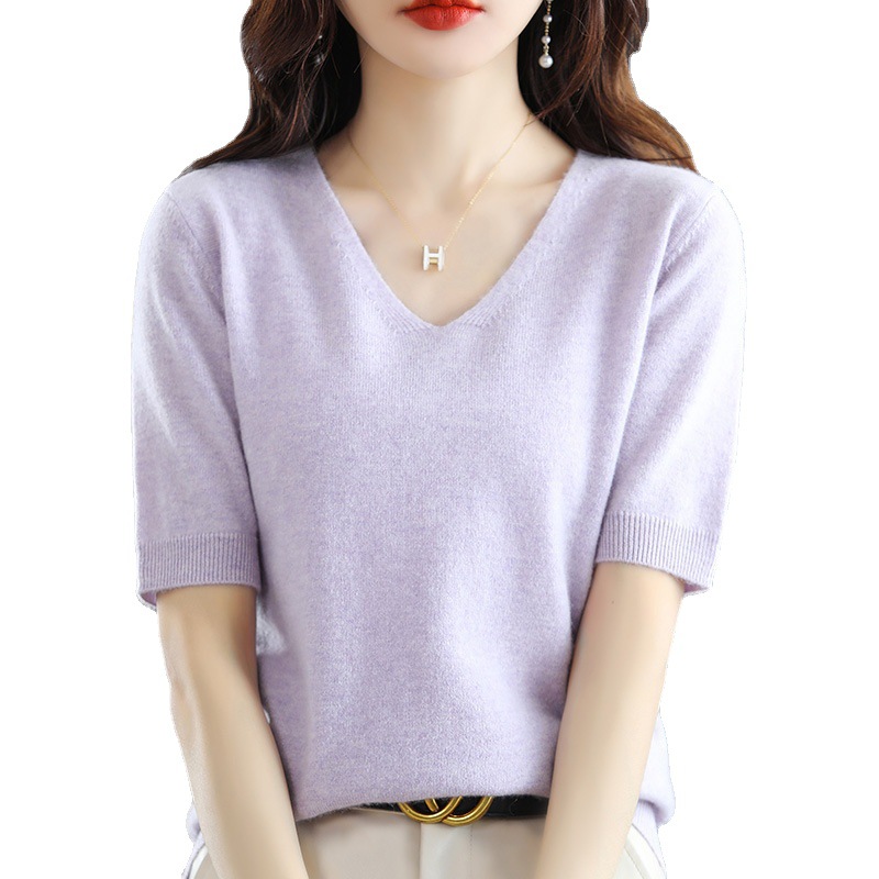 Главная страница > Весной и летом шерстяной женский свитер с V-образным вырезом и короткими рукавами, свободный куриный воротник в виде сердца, Базовая рубашка со средним рукавом, темпераментный Топ оптом