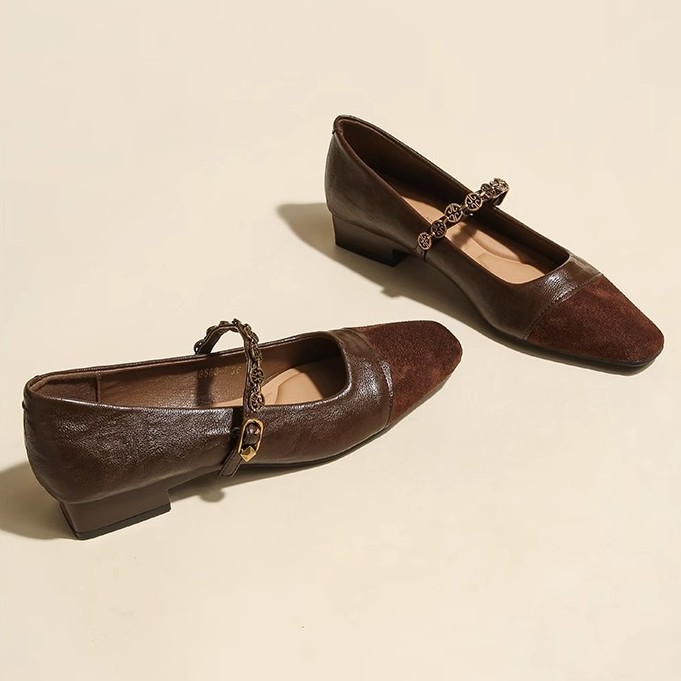 Главная страница > Металлическая цепочка квадратная голова обувь Мэри Джейн женская сшивание слово с толстыми каблуками из овчины, дикие одиночные туфли на низком каблуке коричневые кожаные туфли