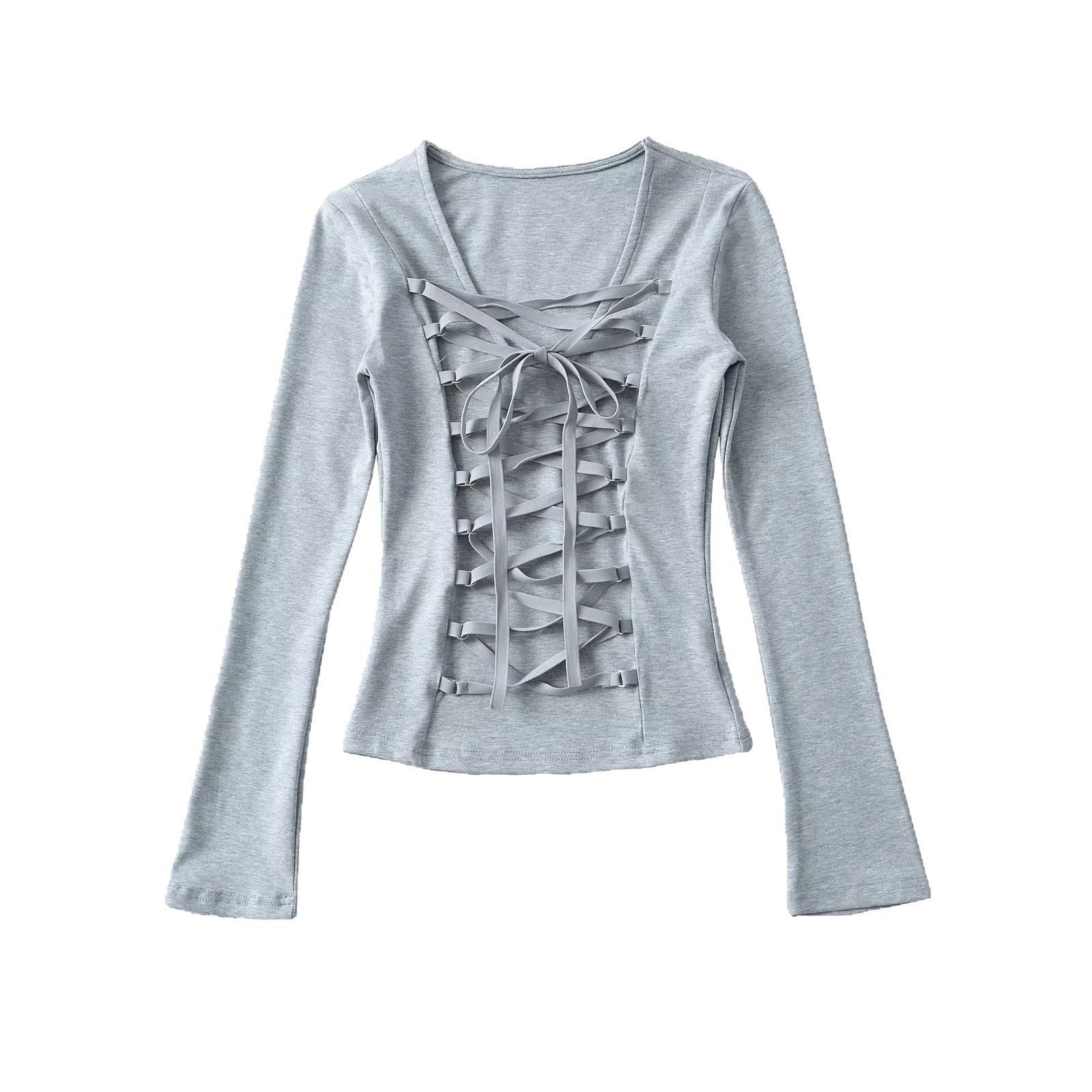 2025 новая женская сексуальная поперечная ремешок с V-образным вырезом с длинными рукавами футболка с нижней рубашкой дизайн тонкий топ