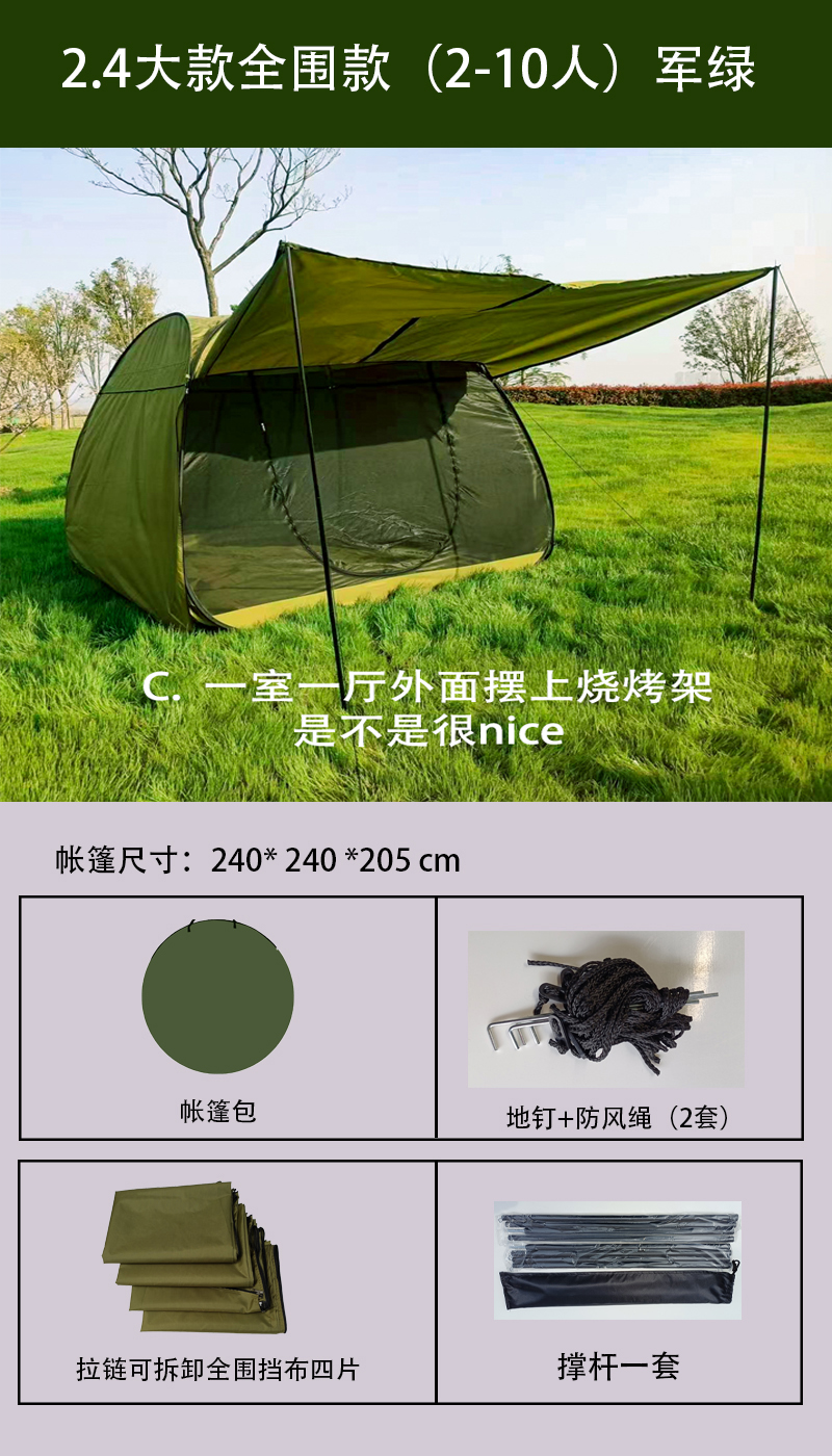 Милитари-зеленый (2.4 * 2.4m) + ткань для защиты от солнца + опорные стойки, включает сумку для хранения, тросы и колышки для крепления.