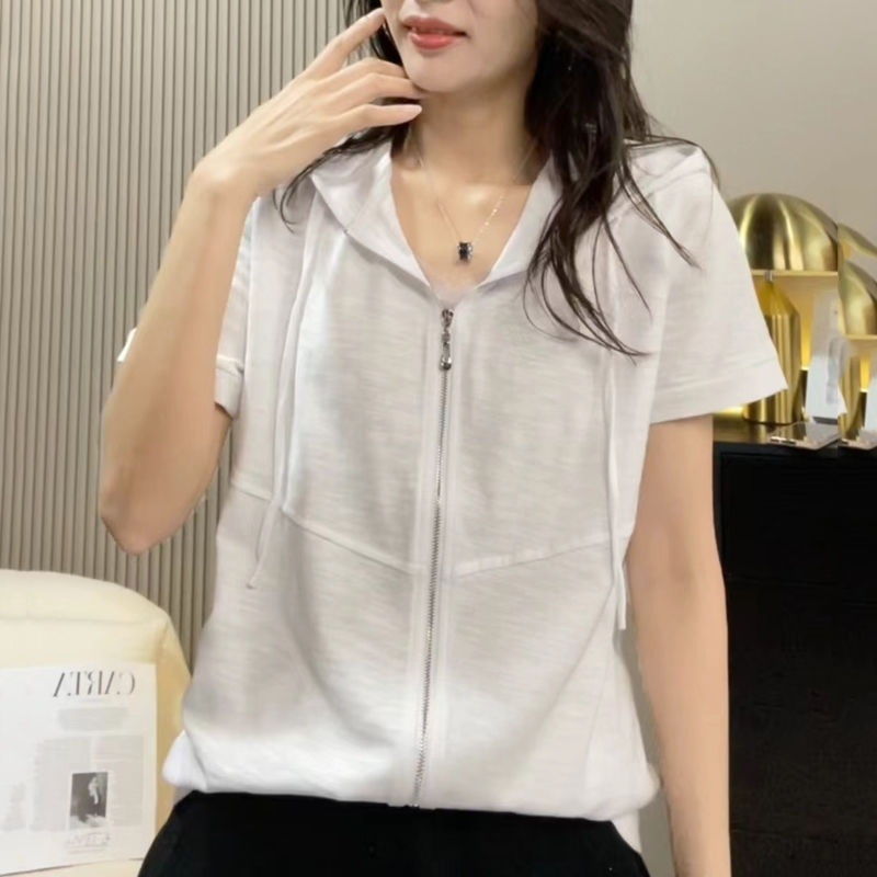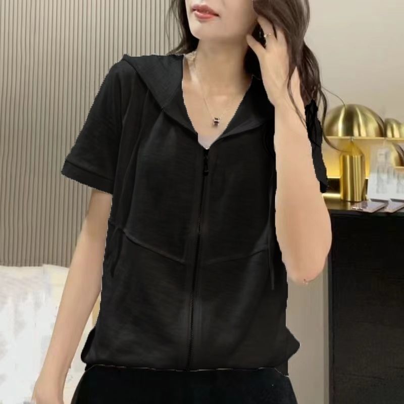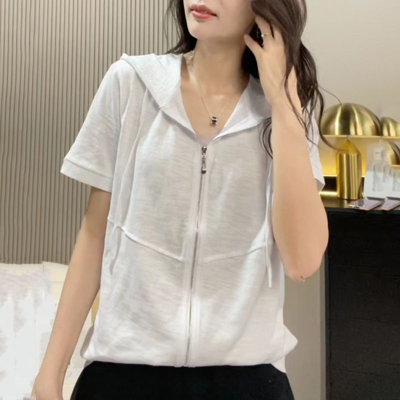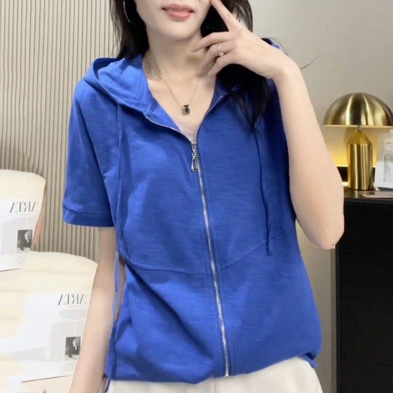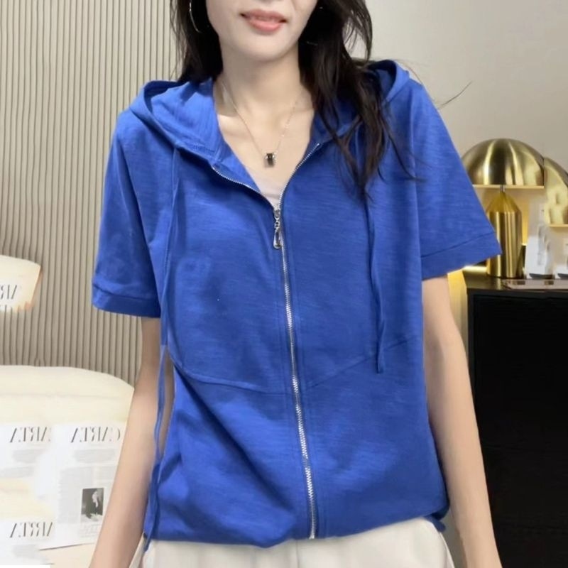 Главная страница > Футболка с капюшоном из чистого хлопка, женская тонкая новая летняя свободная куртка на молнии с короткими рукавами, кардиган с половиной рукавов, повседневная, большого размера, толстая m