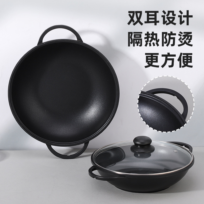 Алюминиевая сковорода-вок с двойным дном и двумя ручками, подходит для газовых и индукционных плит, антипригарная сковорода, кастрюля для сухого приготовления, профессиональная посуда для ресторанов, антипригарная сковорода, сковорода-гриль.