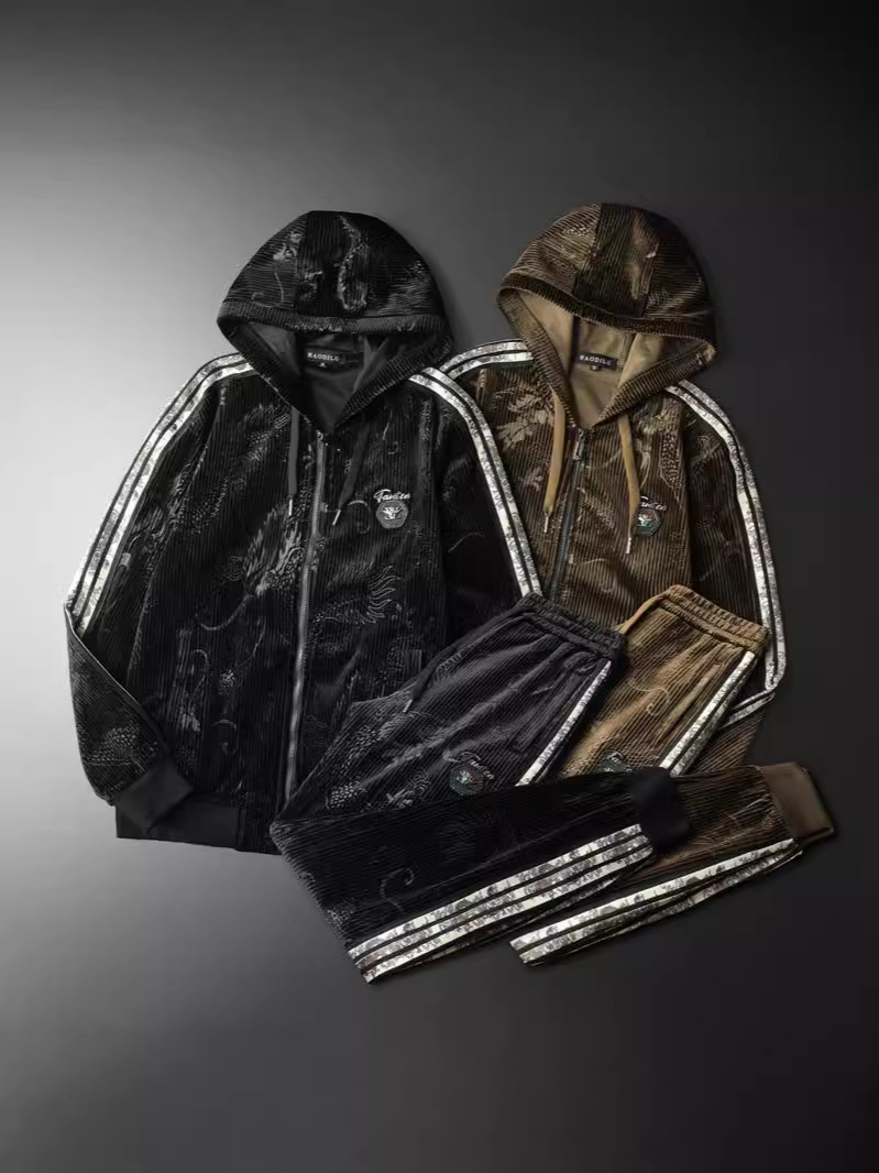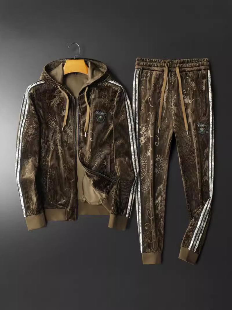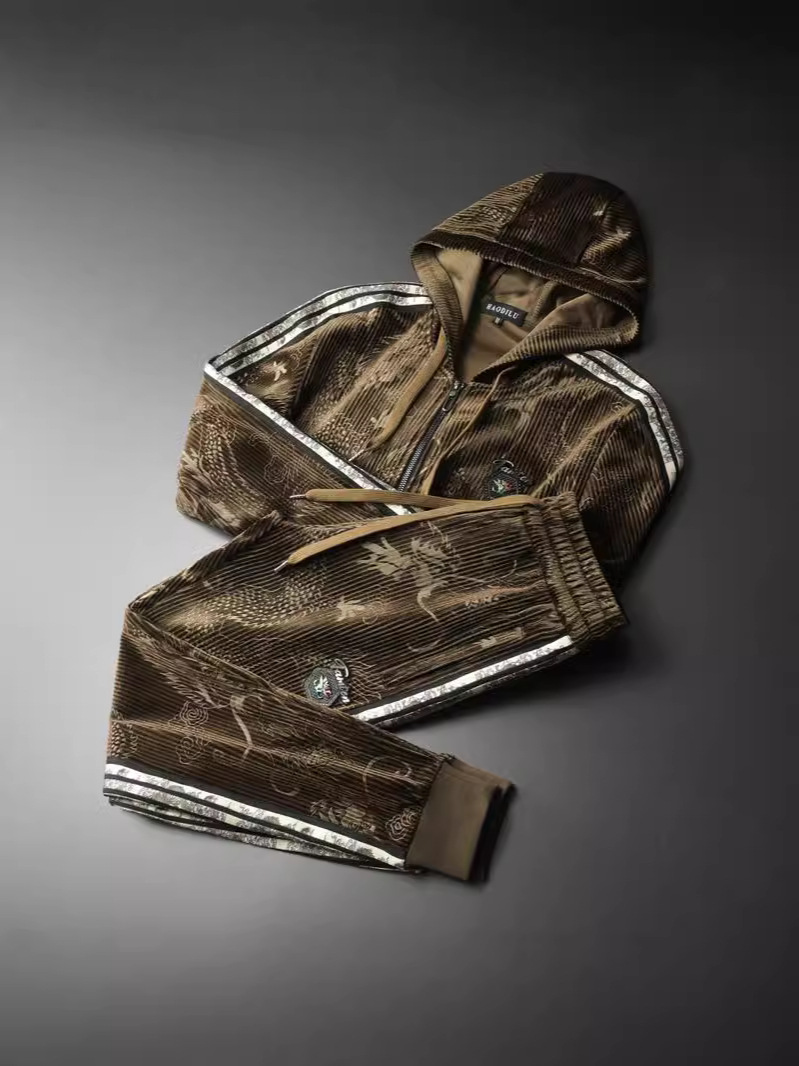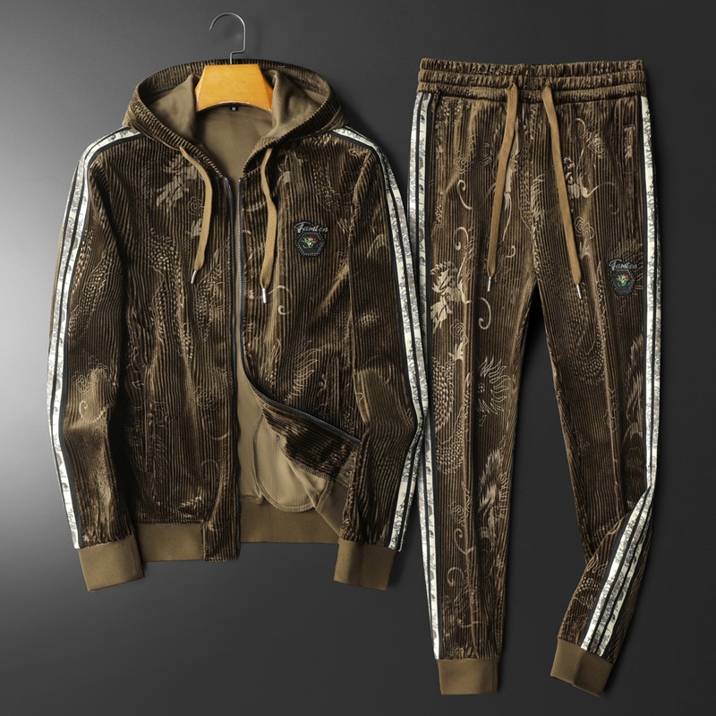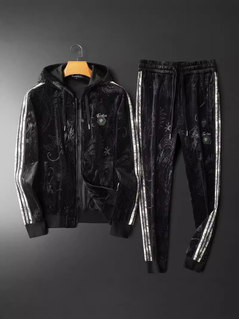 Европейский вокзал 2024 осень и зима новая золотая бархатная вышивка мужской спортивный набор больших размеров с капюшоном повседневный набор из двух частей