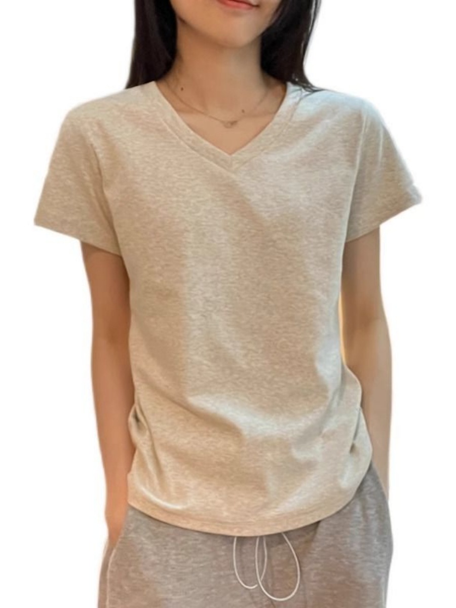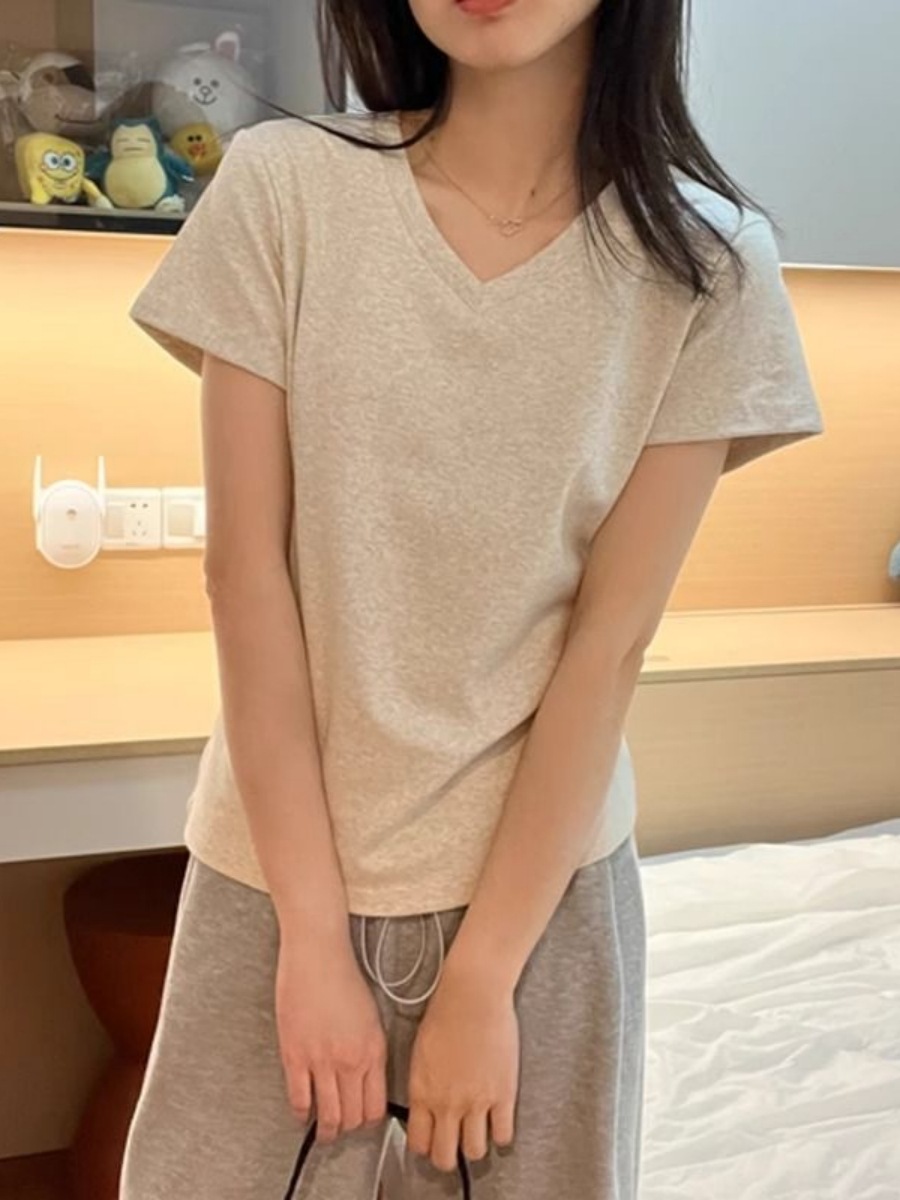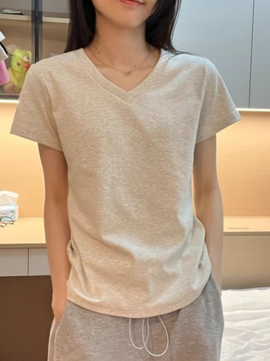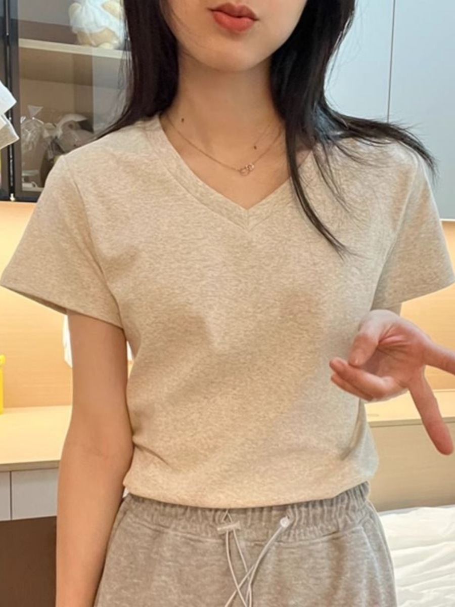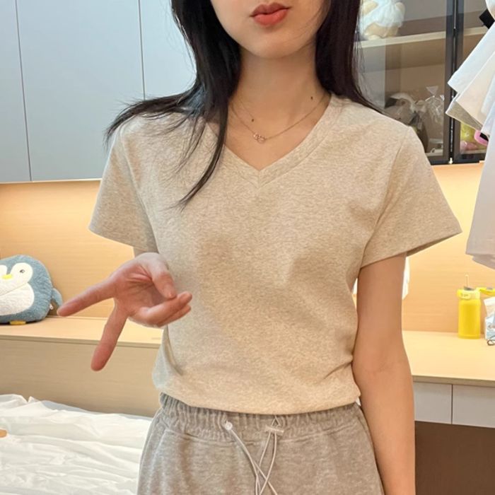 Главная страница > [210 г хлопчатобумажной нити] футболка с v-образным вырезом на плече женская с короткими рукавами летняя тонкая рубашка женская