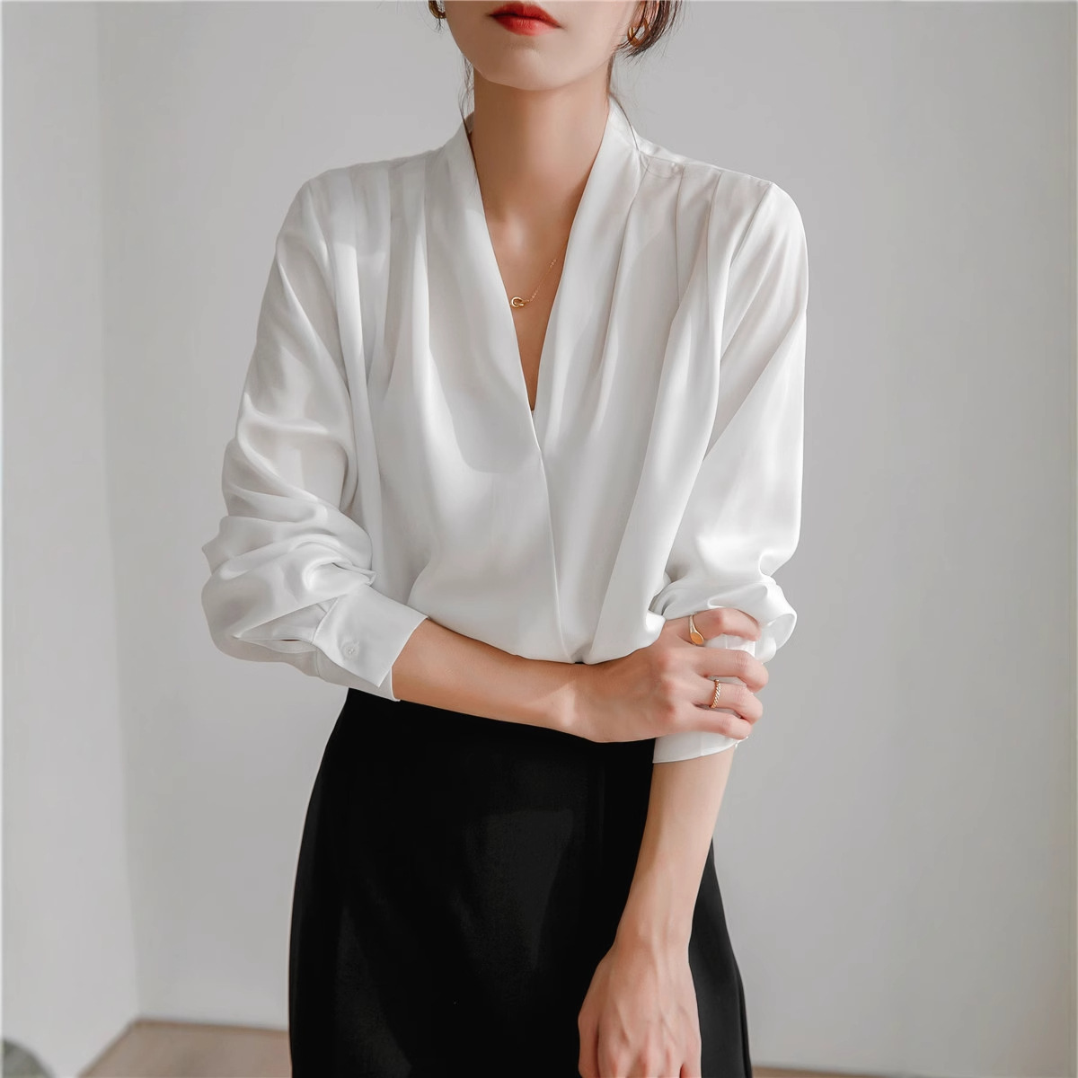 Главная страница > Профессиональная атласная рубашка с длинными рукавами для женщин, весна-осень 2024, глянцевый элегантный французский дизайн, свободный топ в стиле ретро с v-образным вырезом