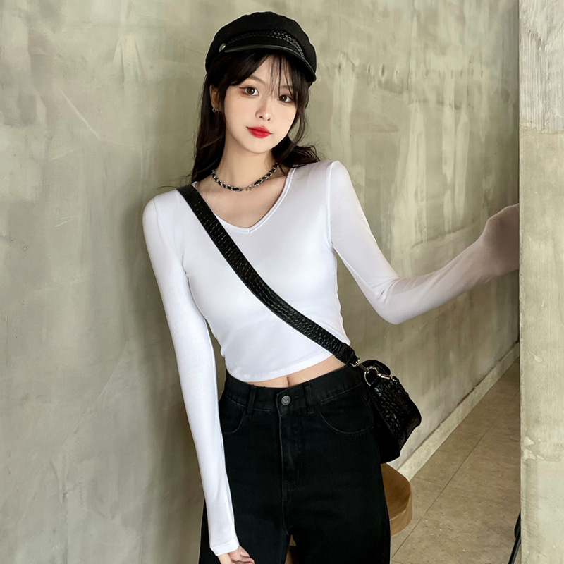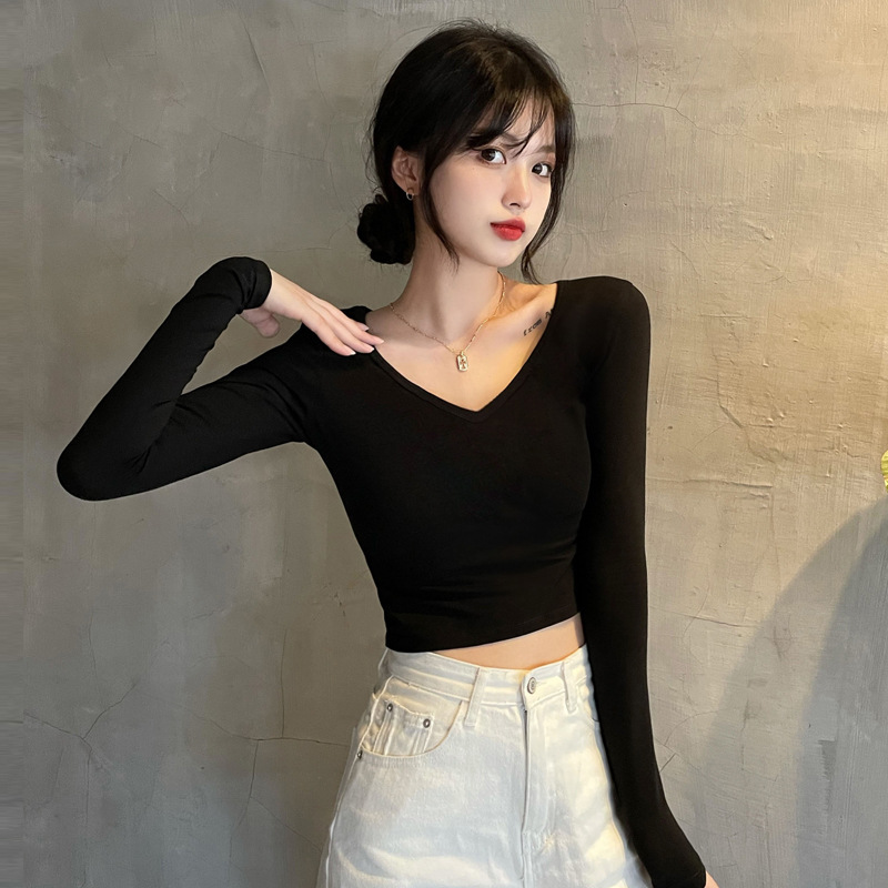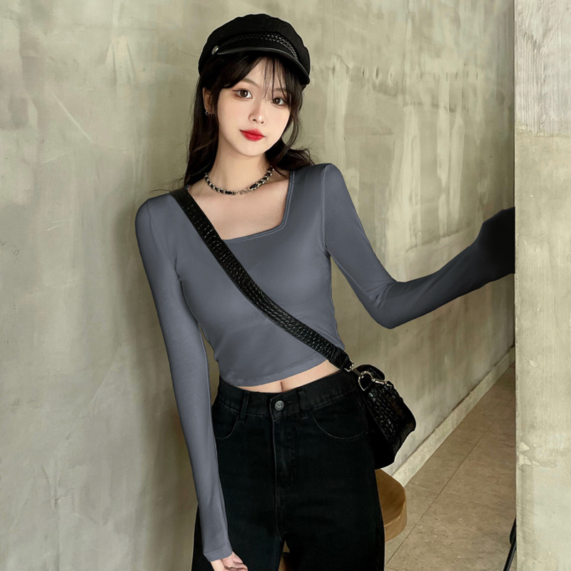 Главная страница > Весенне-осенняя внутренняя одежда, однотонная короткая верхняя одежда, футболка с длинными рукавами, женская рубашка с низом для пупка, плотный квадратный воротник, топ с высокой талией для горячих девушек