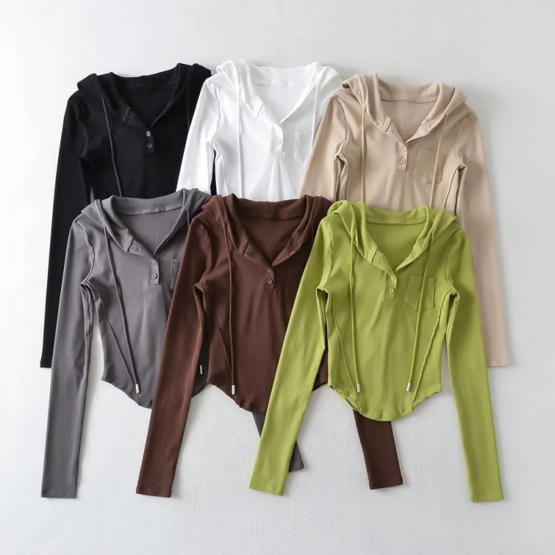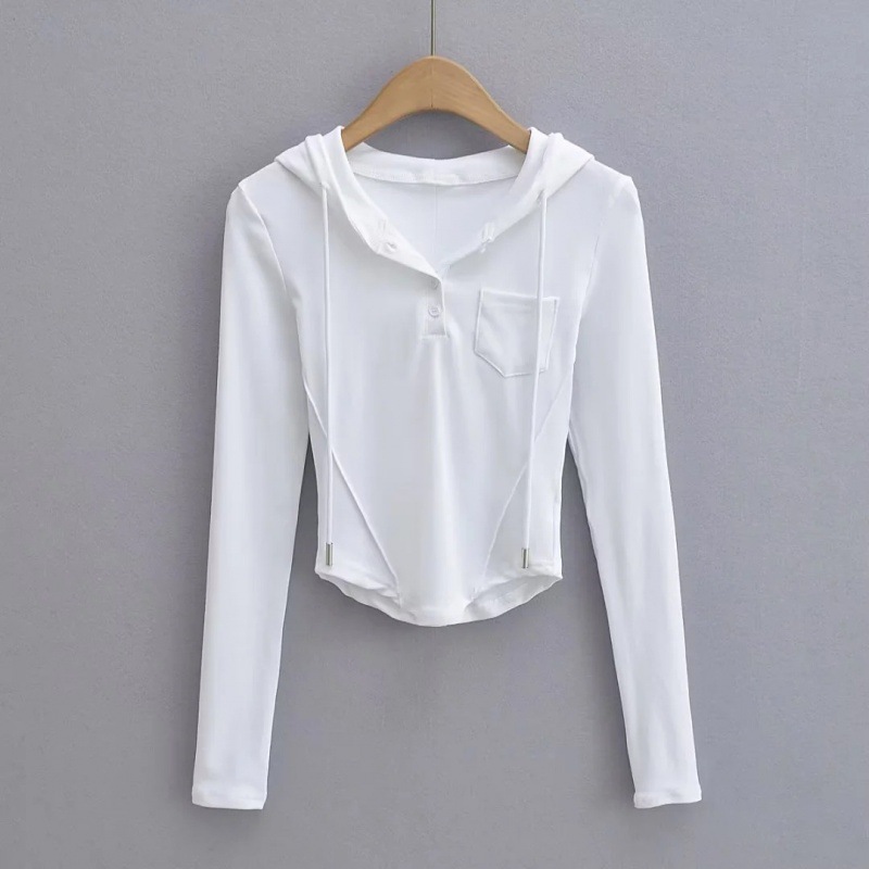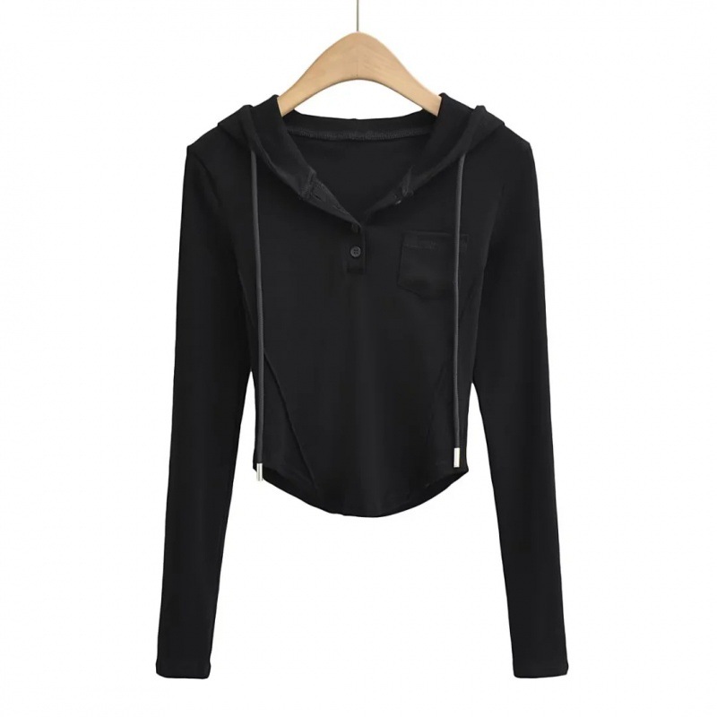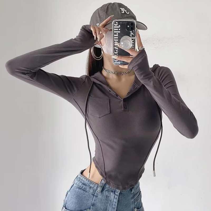 Главная страница > Европейская и американская Женская одежда для девочек Spice, весна и осень, топ с длинными рукавами и капюшоном, Женская толстовка с высокой талией, футболка с изогнутым краем, Базовая рубашка