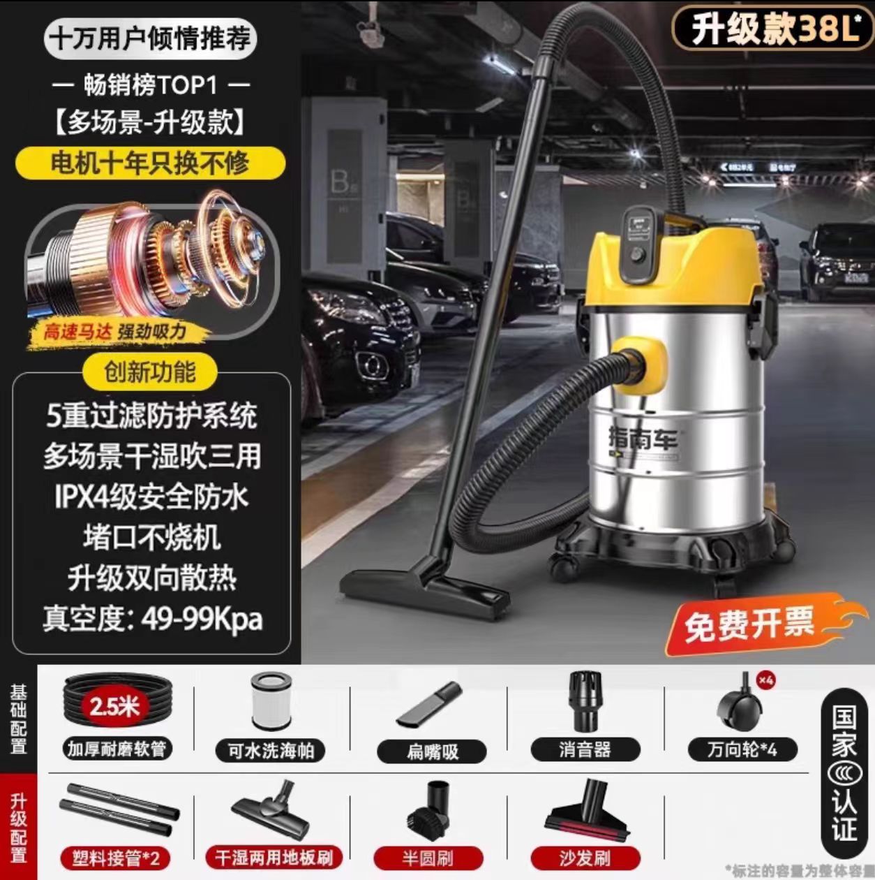 Трёхфазный двигатель с воздушным охлаждением [5500 Вт + мощность всасывания 70 миллионов Па] 38-литровый утолщённый стальной бак с глушителем + функция влажной и сухой уборки + эстетичный дизайн швов + мойка автомобилей