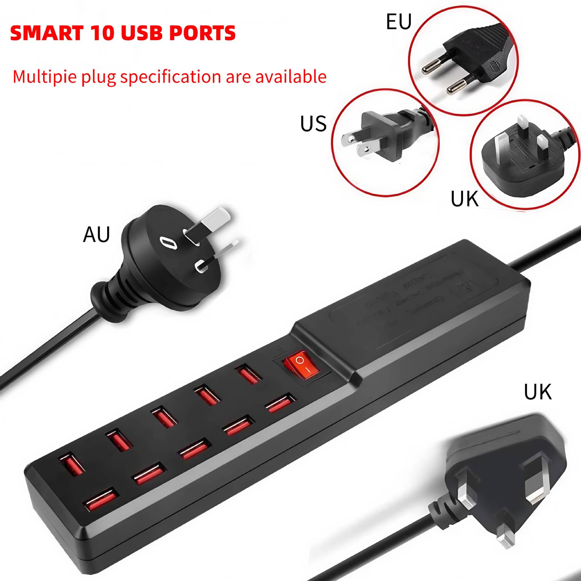 Оптовая продажа зарядных устройств со склада для мобильных телефонов европейского и американского/британского стандартов, интеллектуальное распознавание, 10-портовое зарядное устройство с несколькими USB-портами.