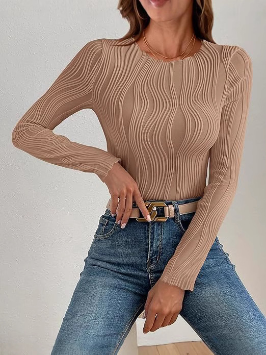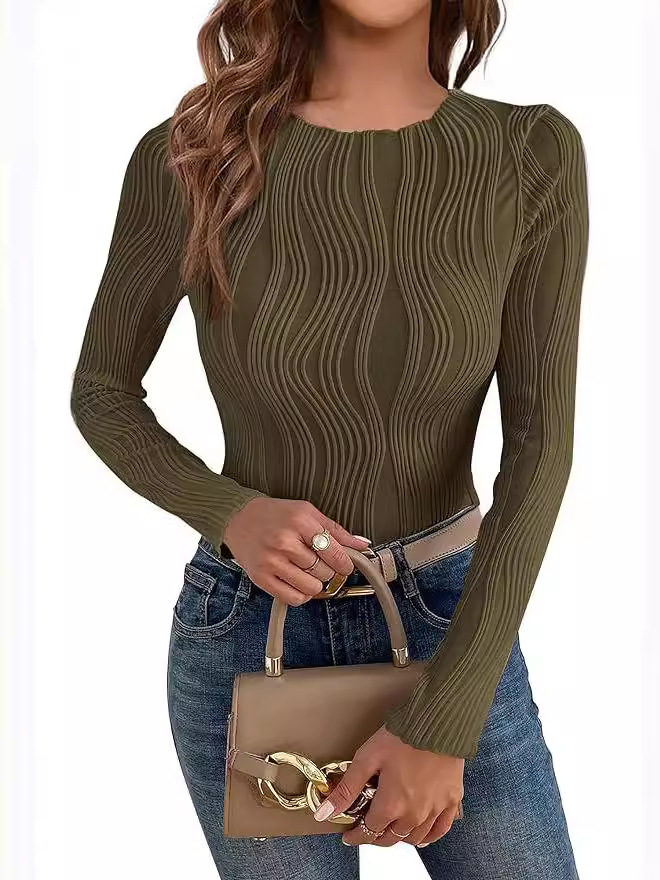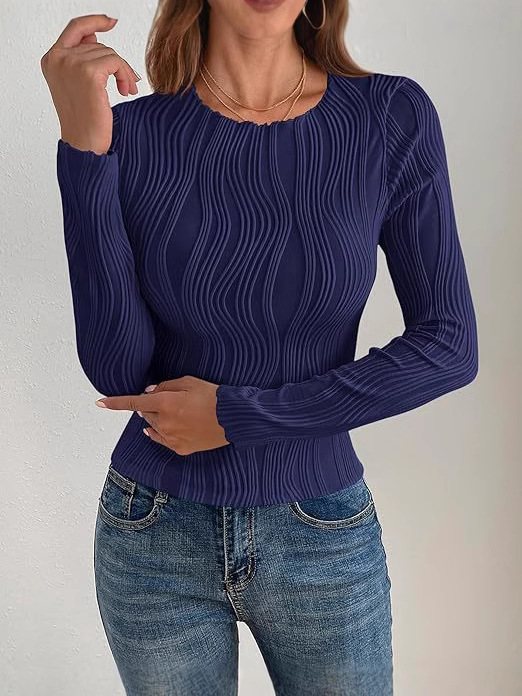 Главная страница > Amazon 2024, трансграничная европейская и американская весенне-осенняя женская новая повседневная текстурированная тонкая женская футболка с круглым вырезом и длинными рукавами