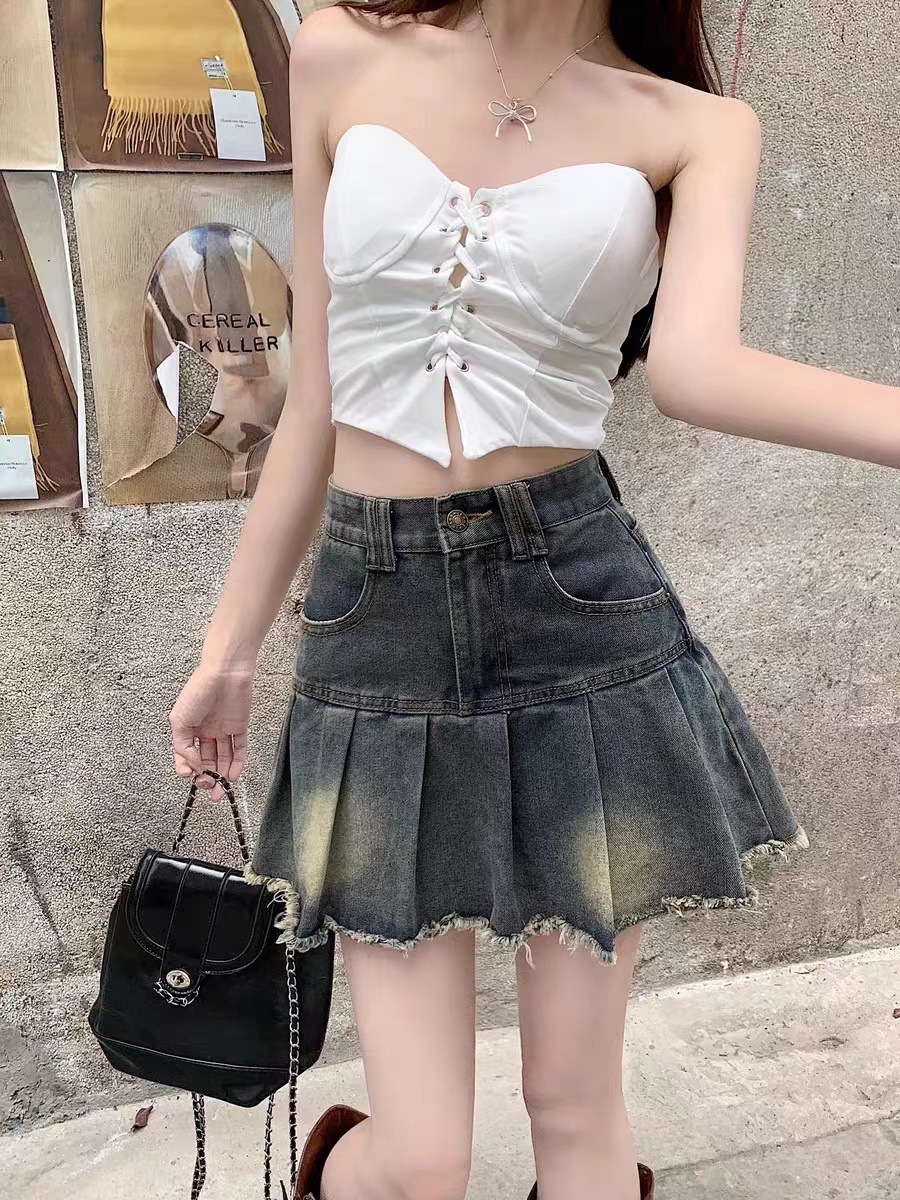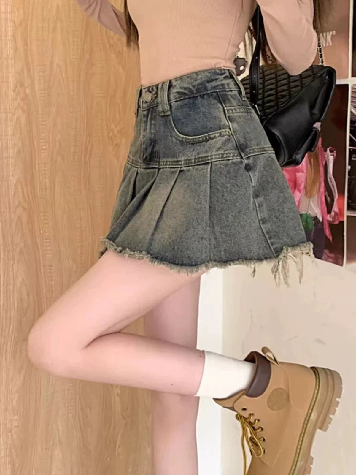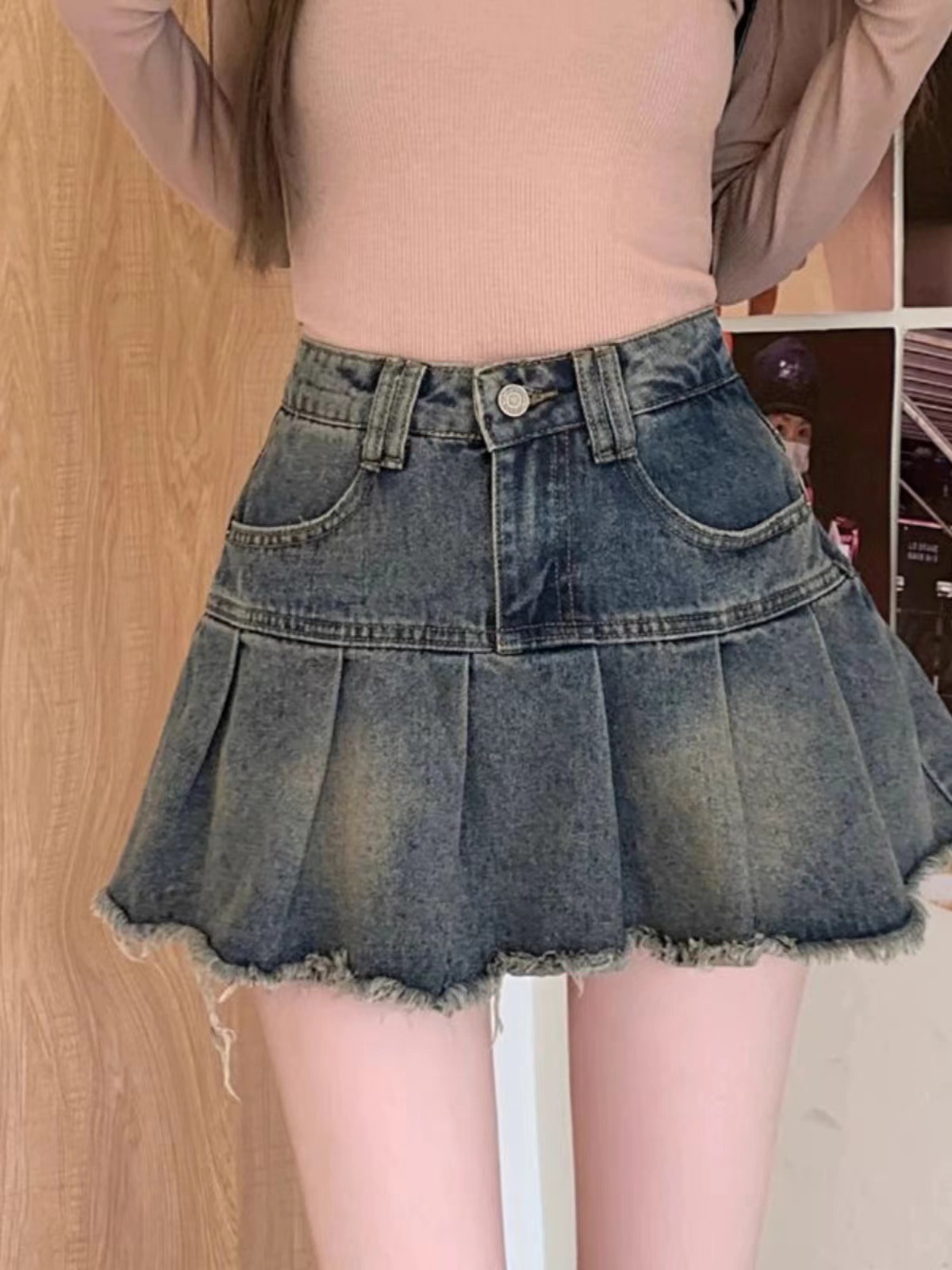Главная страница > Горячая девушка ретро плиссированная джинсовая юбка женское 2024 новое лето с высокой талией