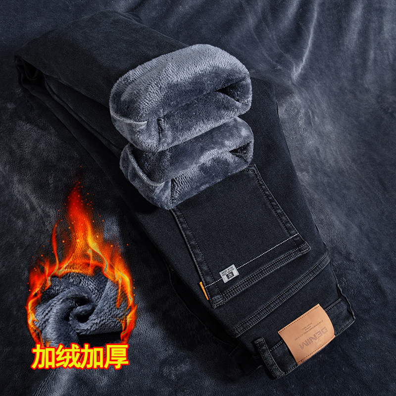 Главная страница > Осенне-зимние высококачественные хлопковые джинсы прямого кроя с начесом, свободные повседневные универсальные мужские брюки, новые эластичные повседневные штаны