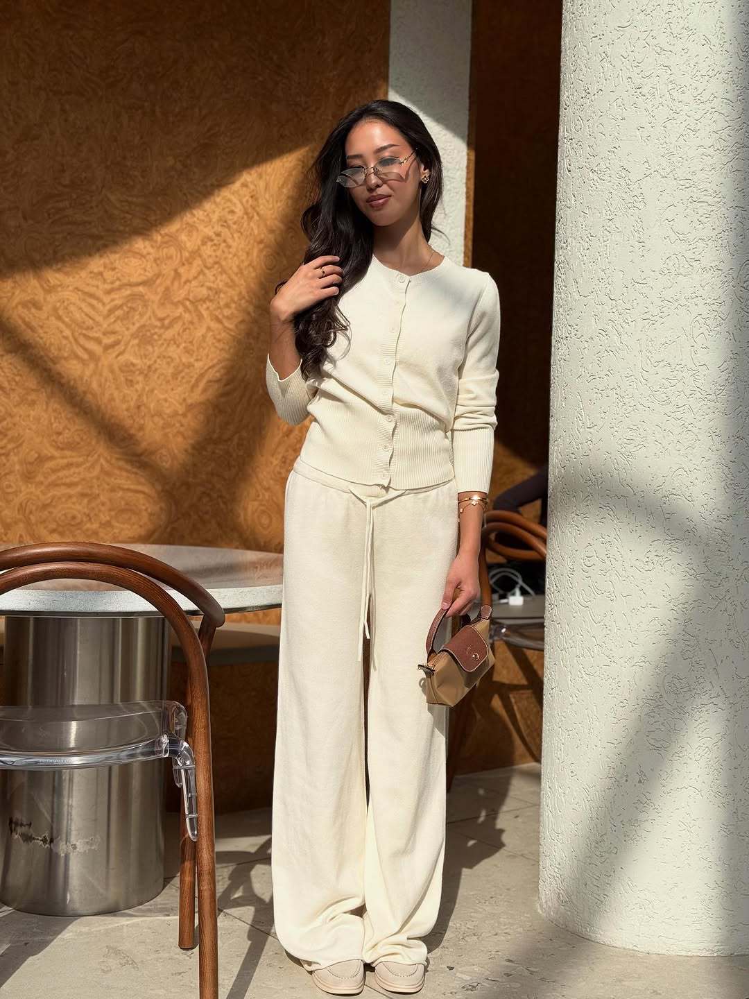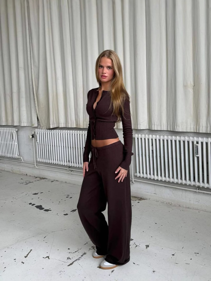 Главная страница > Европейский и американский стиль чистой страсти: сексуальный вязаный костюм, облегающий, с пуговицами, длинные рукава, низкая талия, повседневные брюки, комплект из двух предметов для женщин