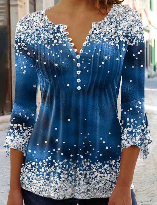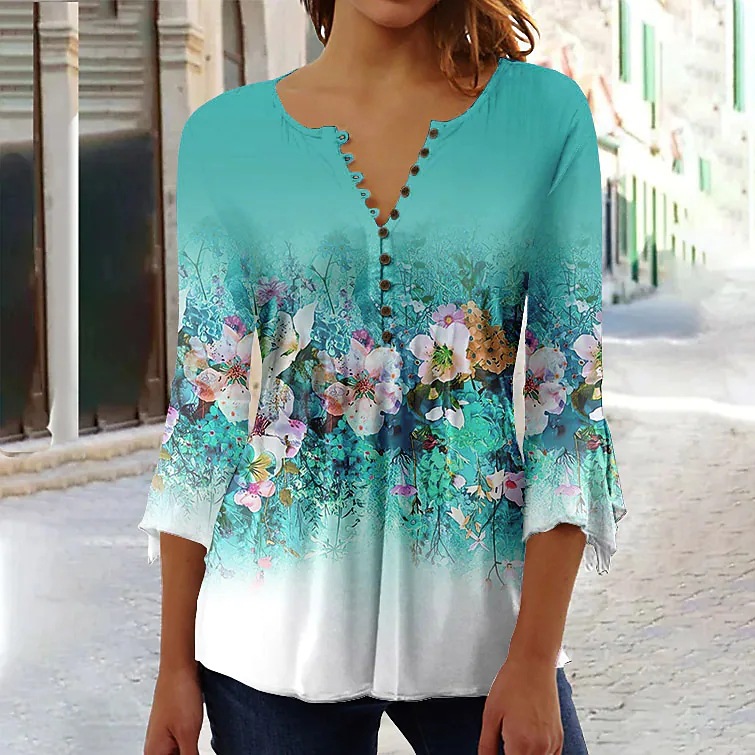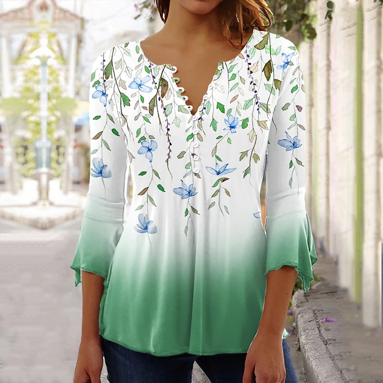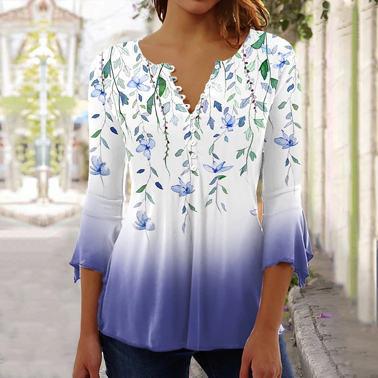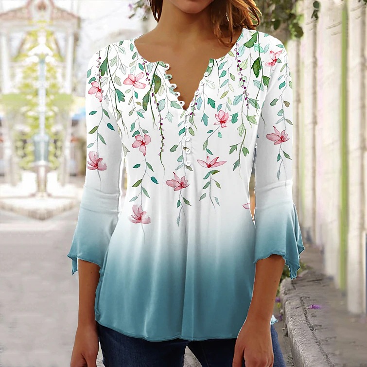 Главная страница > Внешняя торговля Весенняя Новая женская футболка на пуговицах с 3D Цифровым принтом, женская футболка с V-образным вырезом, рукавом-колокольчиком, пуловер, нижняя рубашка, Топ