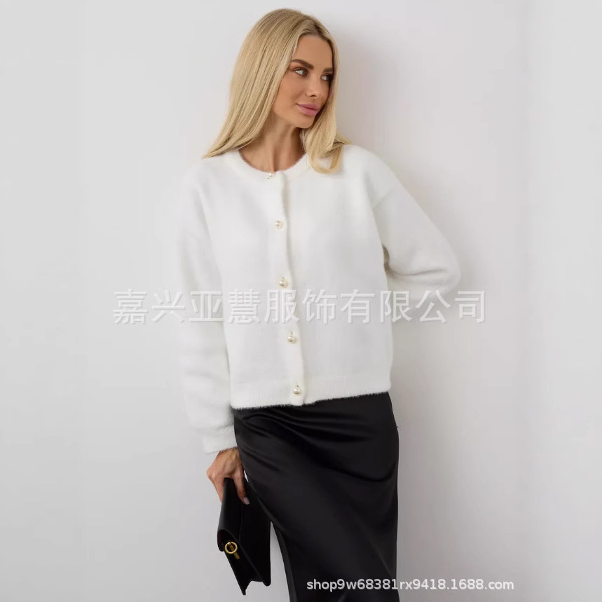 Главная страница > Трансграничный белый вязаный кардиган женский 2025 осень-зима новый свободный плюшевый норковый короткий топ