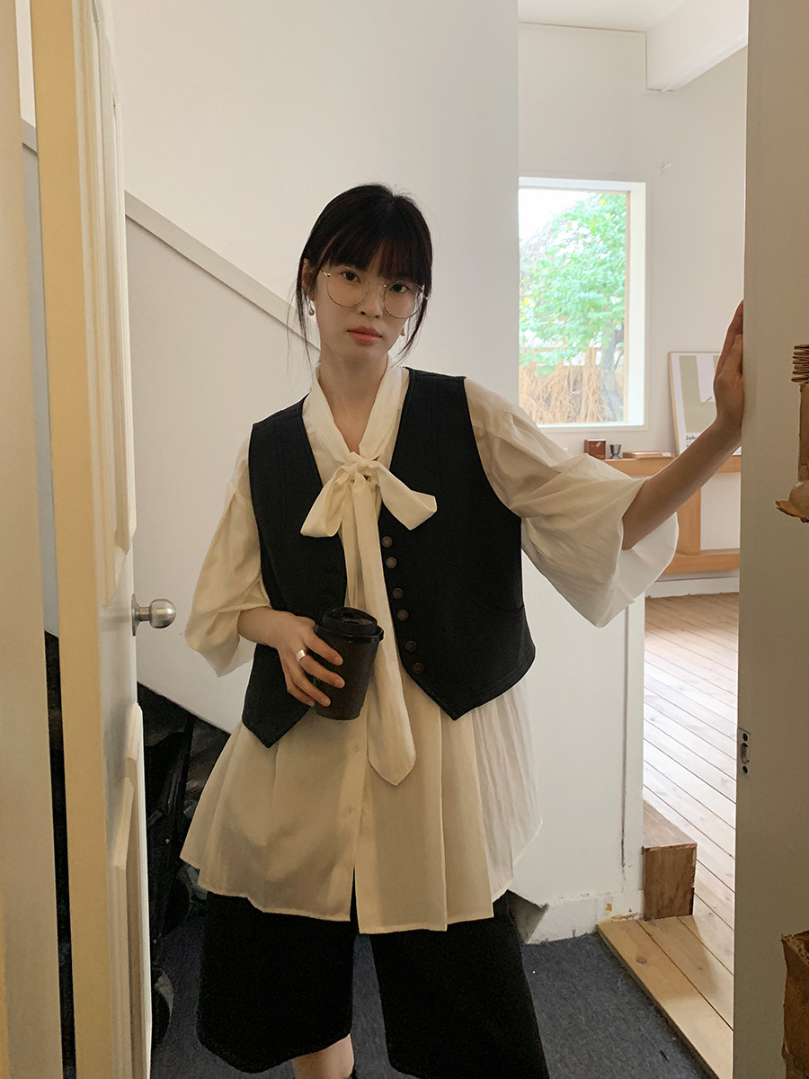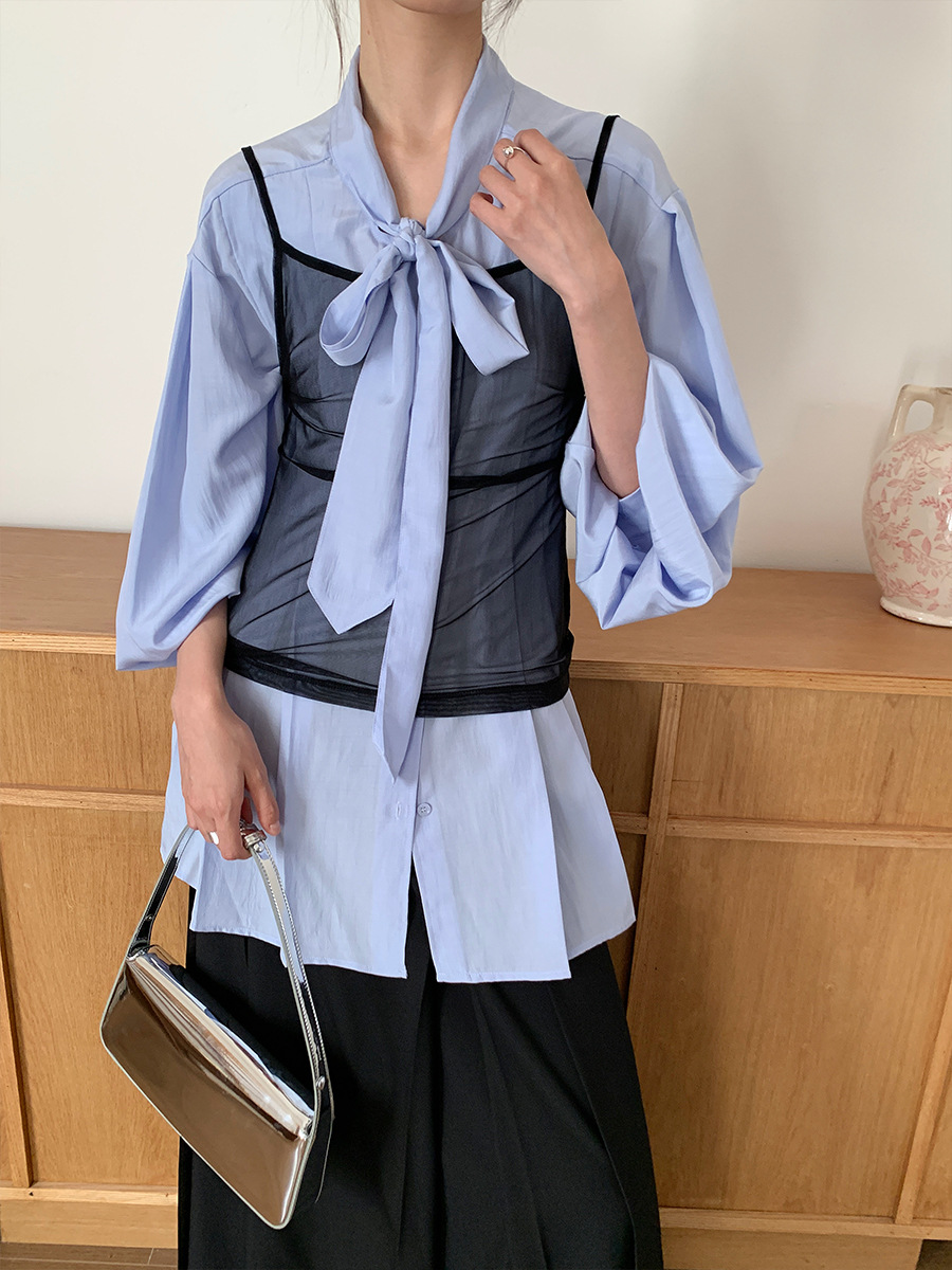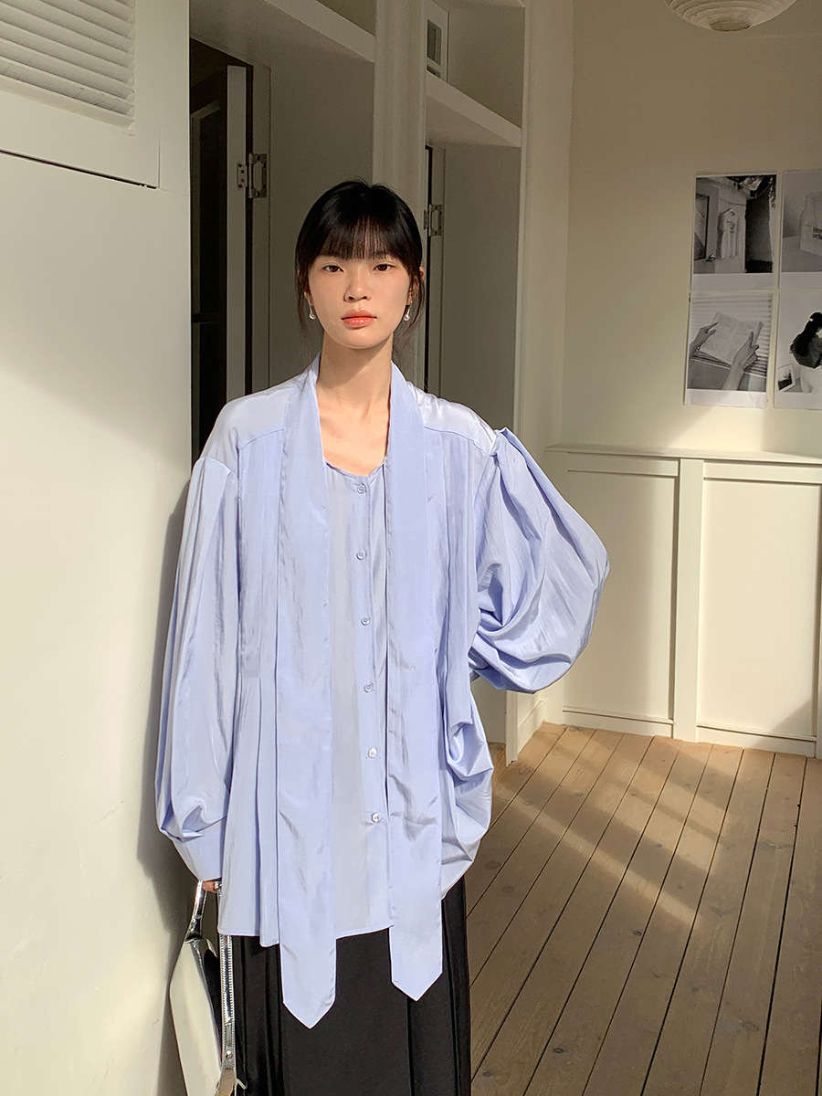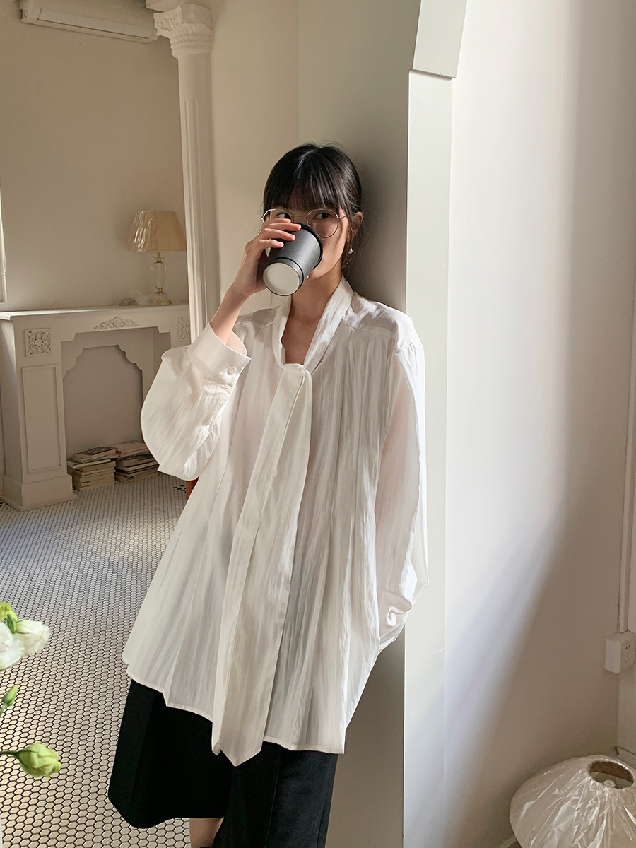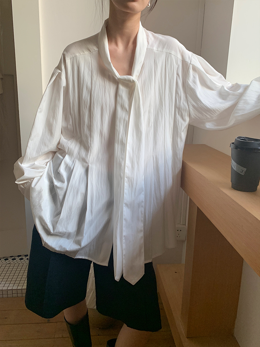 Главная страница > Wanwei французская глянцевая плиссированная рубашка для женщин 2025 весна-осень новый дизайн рубашка с воротником на шнуровке P1211
