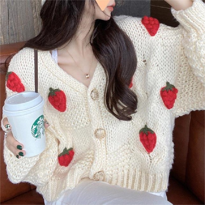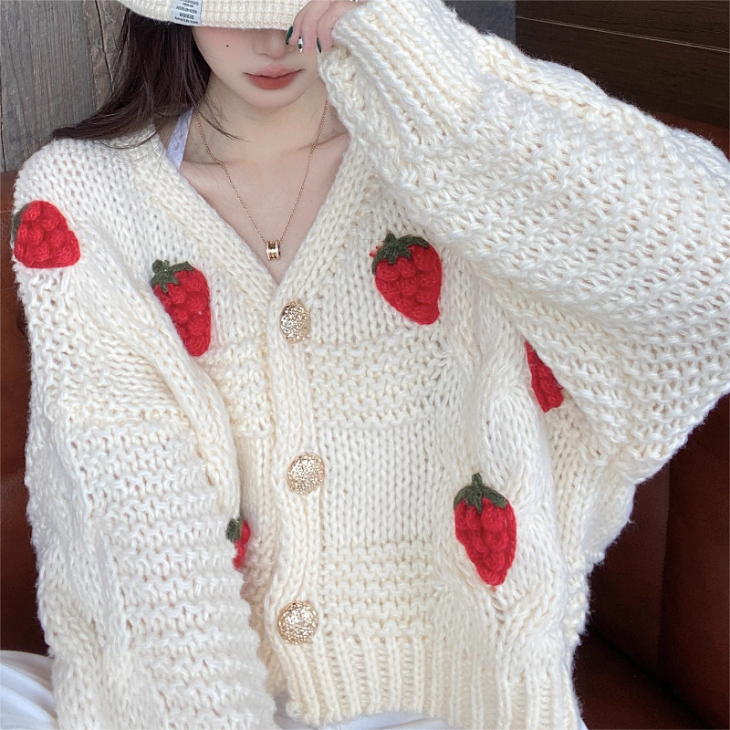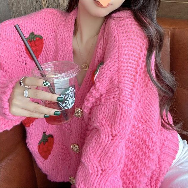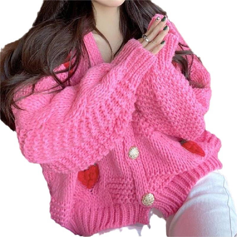 2024, новинка осени и зимы, корейский стиль, v-образный вырез, сладкий стиль, клубничный трикотаж, мягкий восковой толстый шерстяной трикотаж, верхняя куртка для женщин