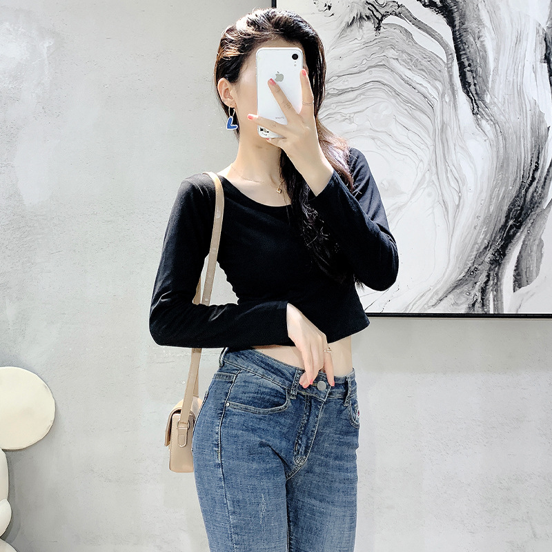 Осеннее платье Корейская футболка с длинным рукавом в пупок Женский Осенний короткий протекающий трикотаж с завышенной талией однотонный спортивный топ с завышенной талией