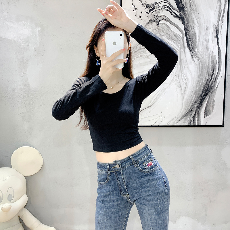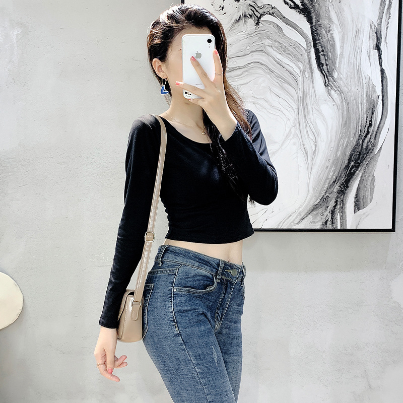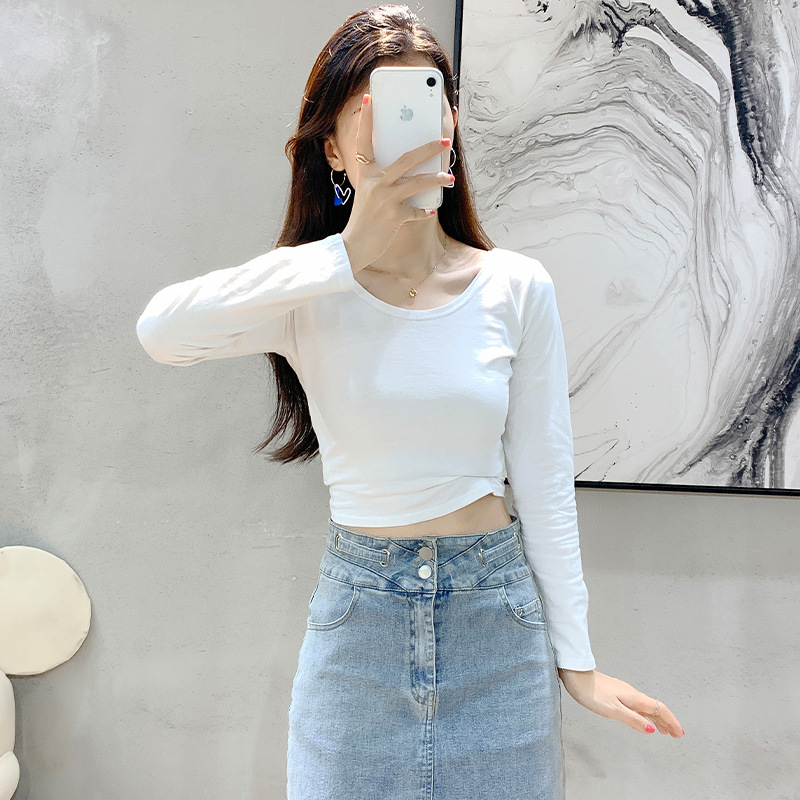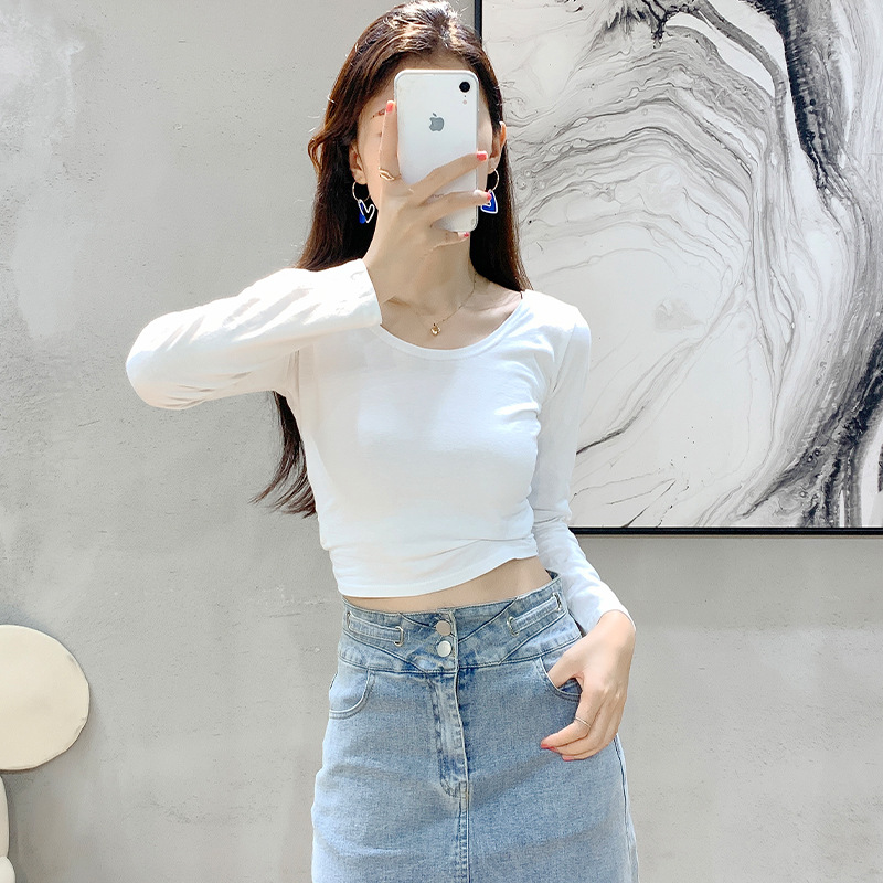 Главная страница > Осеннее платье Корейская футболка с длинным рукавом в пупок Женский Осенний короткий протекающий трикотаж с завышенной талией однотонный спортивный топ с завышенной талией