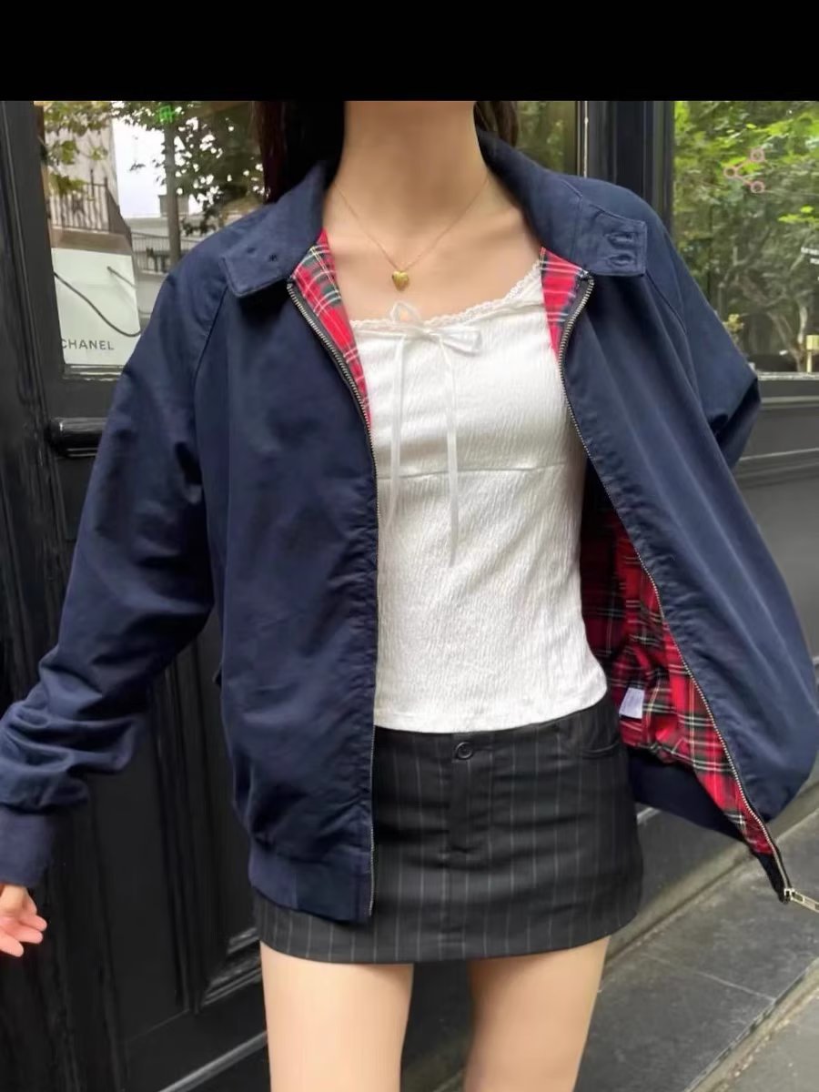 Главная страница > BM новый стиль стоячий воротник красная клетчатая свободная тонкая Летающая куртка с длинным рукавом Женская бейсбольная форма BM пальто мотоциклетный Топ
