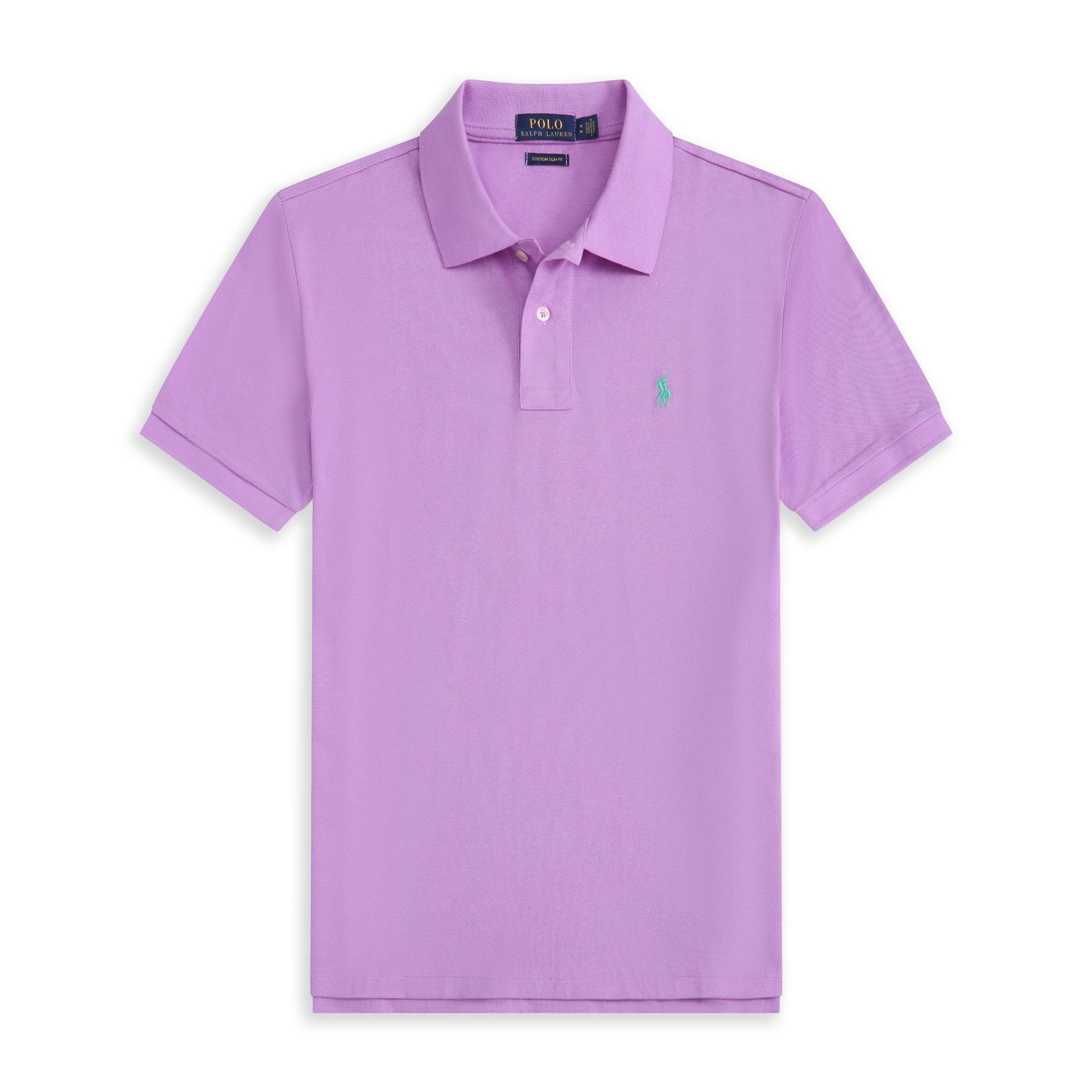 Розовая рубашка-поло с синей этикеткой озера