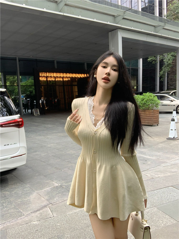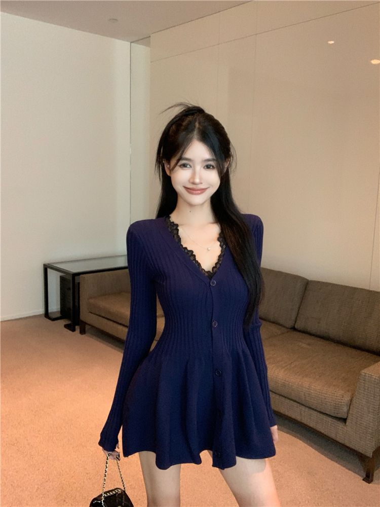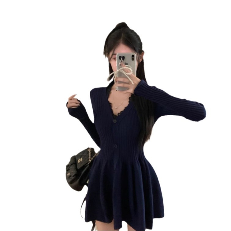 Главная страница > Чистый ветер, вязаное платье с V-образным вырезом, женская осень 2024 новая талия
