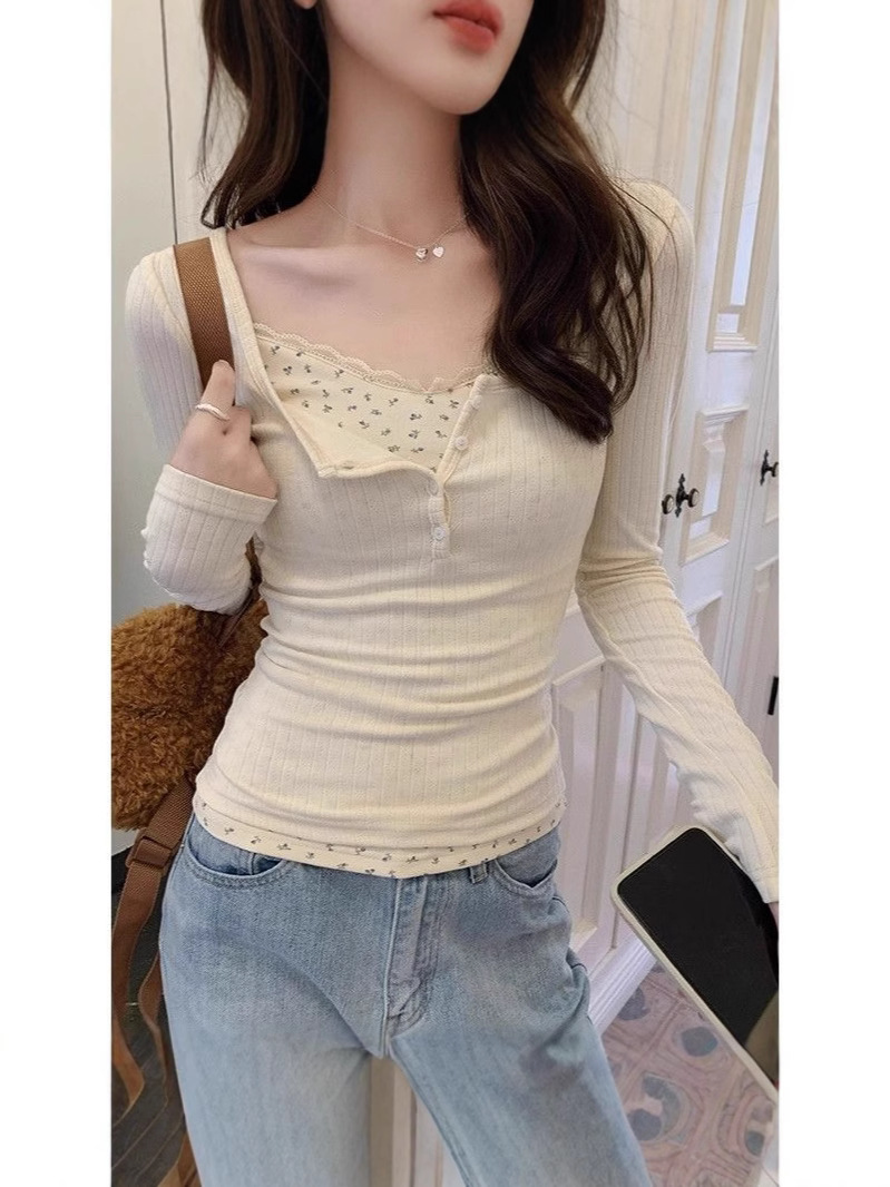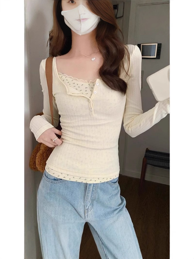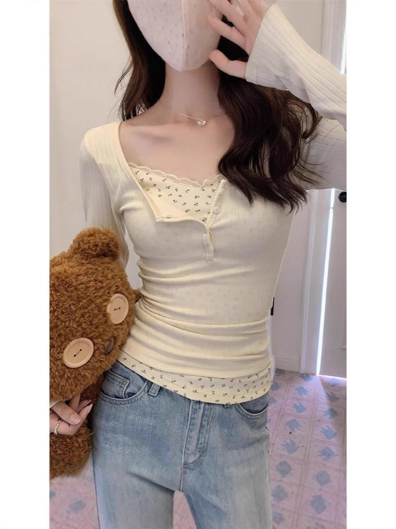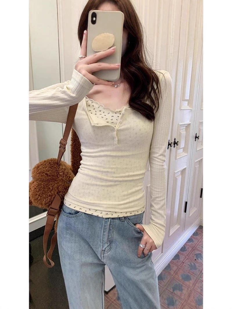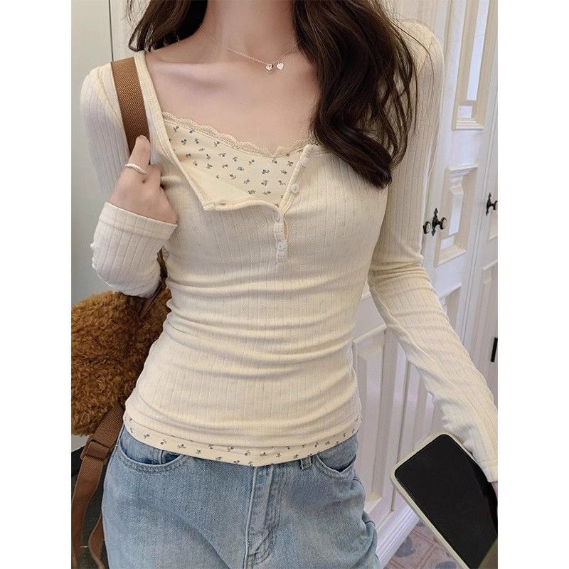 Главная страница > Чистый ветер кружева с низким вырезом футболка женская ранняя весна поддельные две части bm цветочный срезанный нижний рубашка с коротким топом