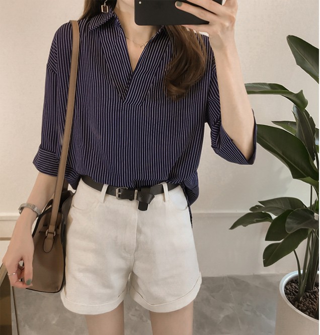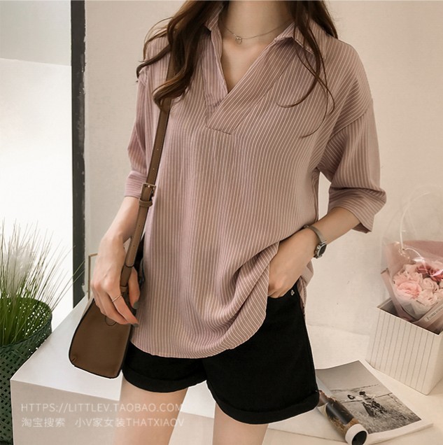 Главная страница > Весенне-летняя новая свободная рубашка в тонкую полоску большого размера в Корейском стиле, женский топ с семью рукавами, универсальный отдых