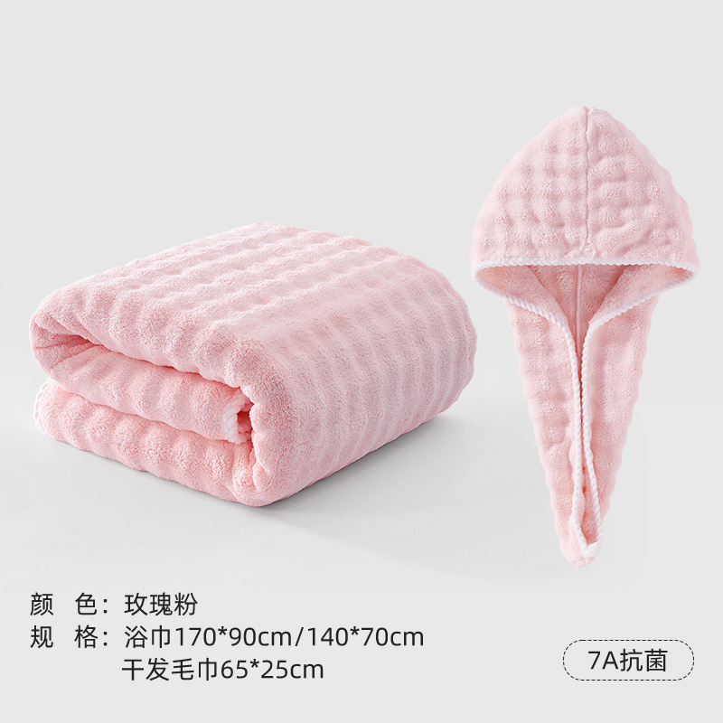 (Розово-розовое) банное полотенце + полотенце для сушки волос [Кремовый бархат с пузырьками, антибактериальный класс 7А]