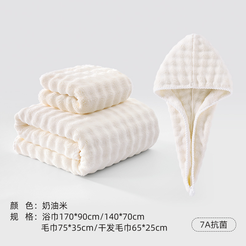 (Кремовый рис) Банное полотенце + Полотенце для рук + Полотенце для сушки волос [Кремовый бархат с пузырьками, антибактериальный класс 7А]