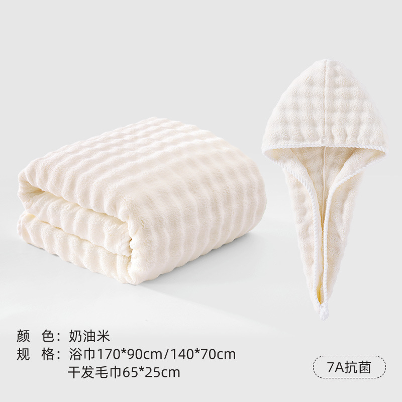(Кремовый рис) Банное полотенце + Полотенце для сушки волос [Кремовый бархат с пузырьками, антибактериальный класс 7А]