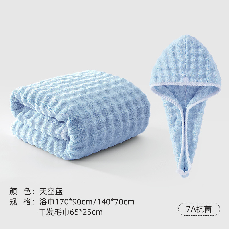 (Небесно-голубой) Банное полотенце + Полотенце для сушки волос [Кремовый бархат с пузырьками, антибактериальный класс 7А]