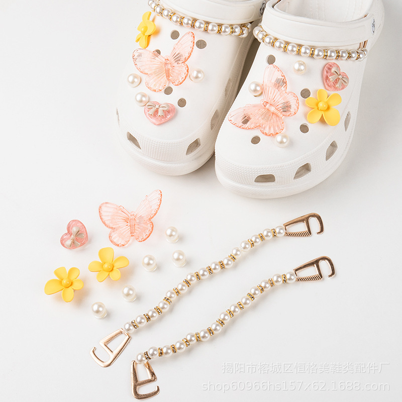 Жемчужная цепочка с розовой бабочкой [Набор из 10 пряжек]#Обувь в комплект не входит]