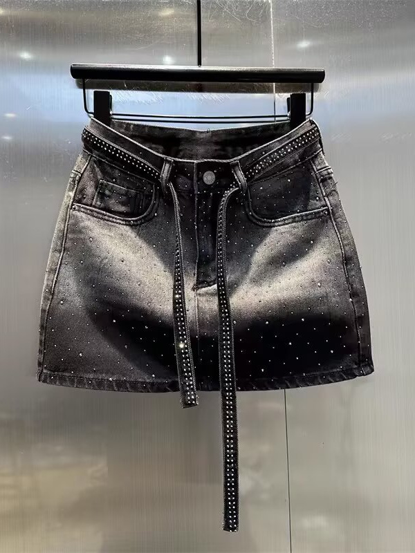 Плюс размер ретро градиентная джинсовая юбка с горячими стразами для женщин, летняя, для полных, высокая талия, утягивающая, закрывающая бедра, юбка-трапеция, короткая