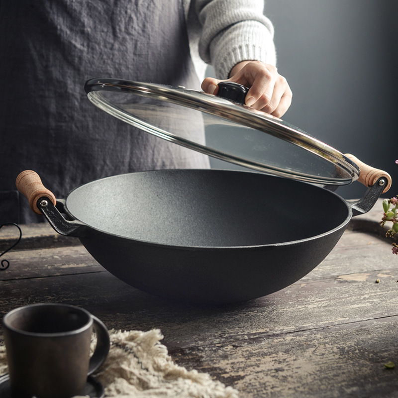 Главная страница > Утолщенный бинауральный чугунный горшок с деревянной ручкой Старомодный большой железный горшок с круглым дном Бытовой железный горшок с необработанным антипригарным покрытием для газа