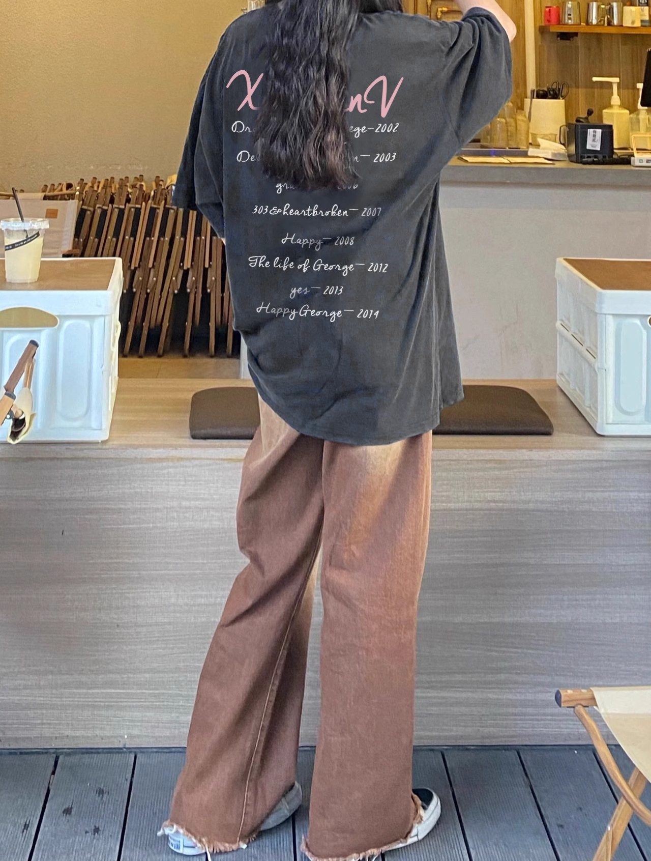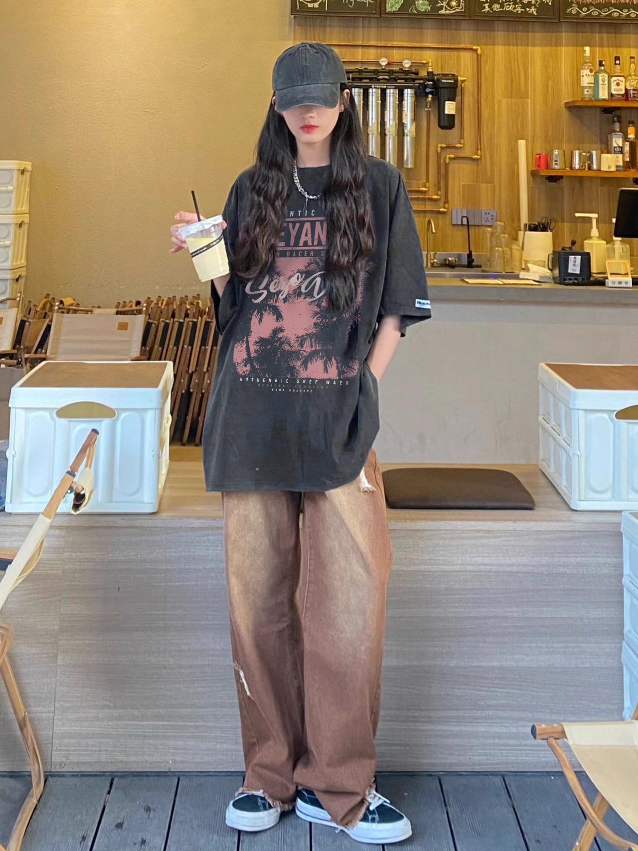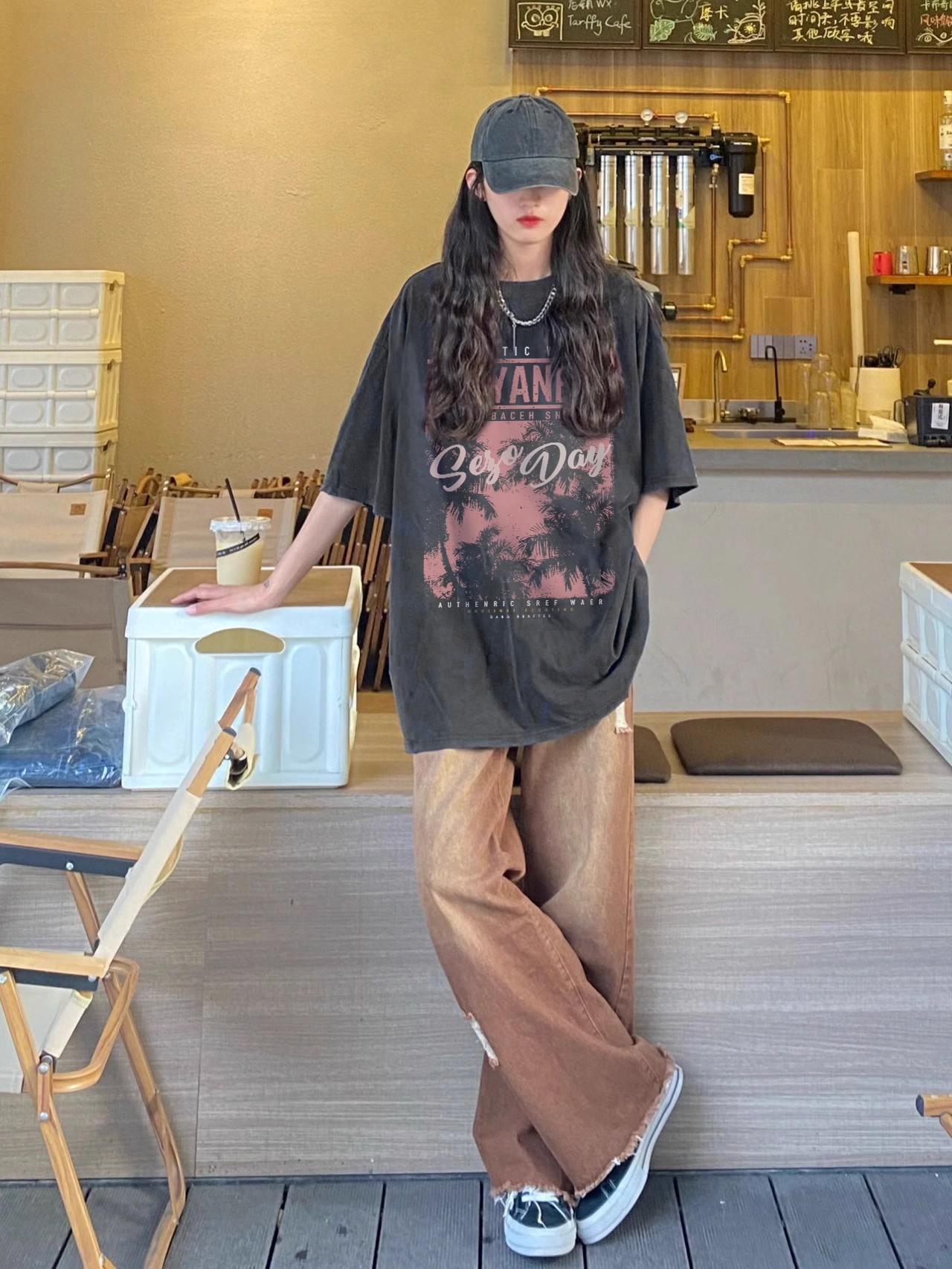 Хлопок 100% трепетание волос американский ретро серый носить футболку большого размера с короткими рукавами летняя европейская и американская мода топ