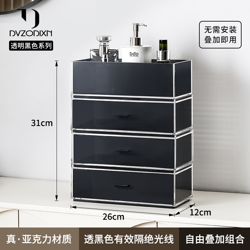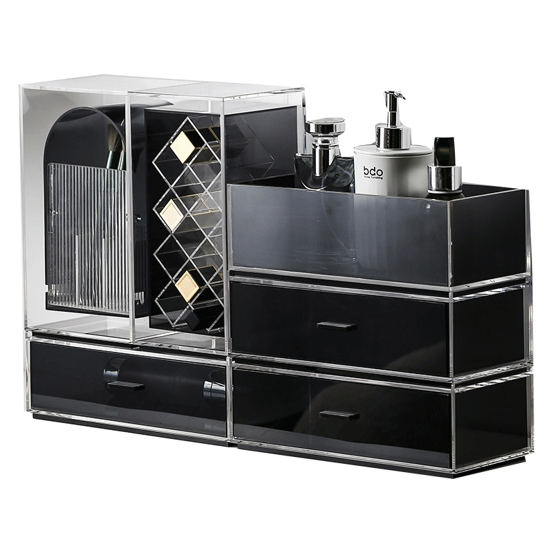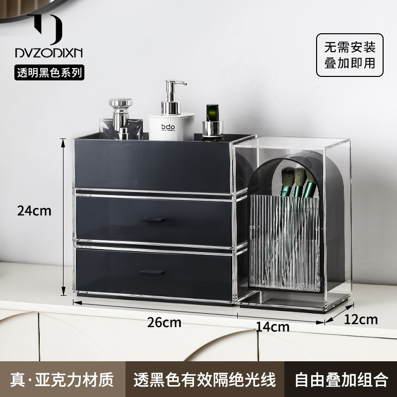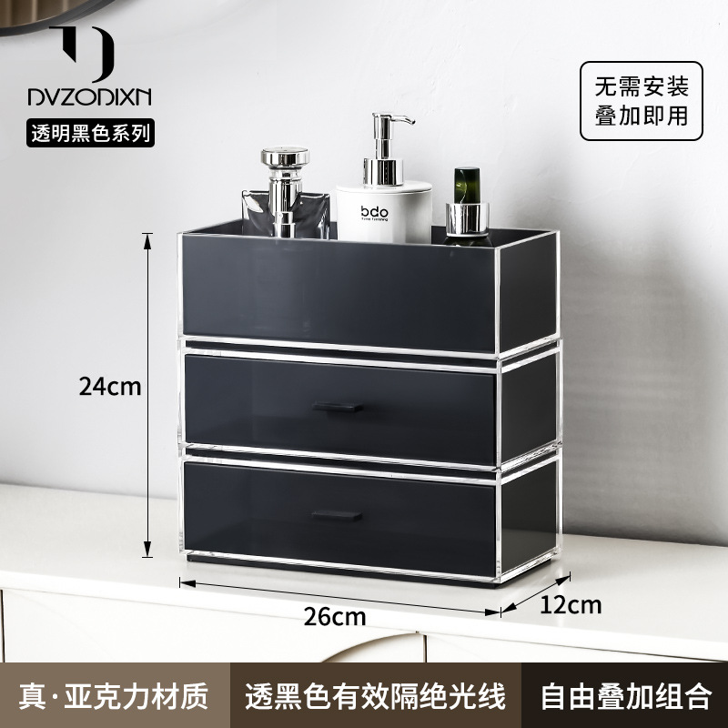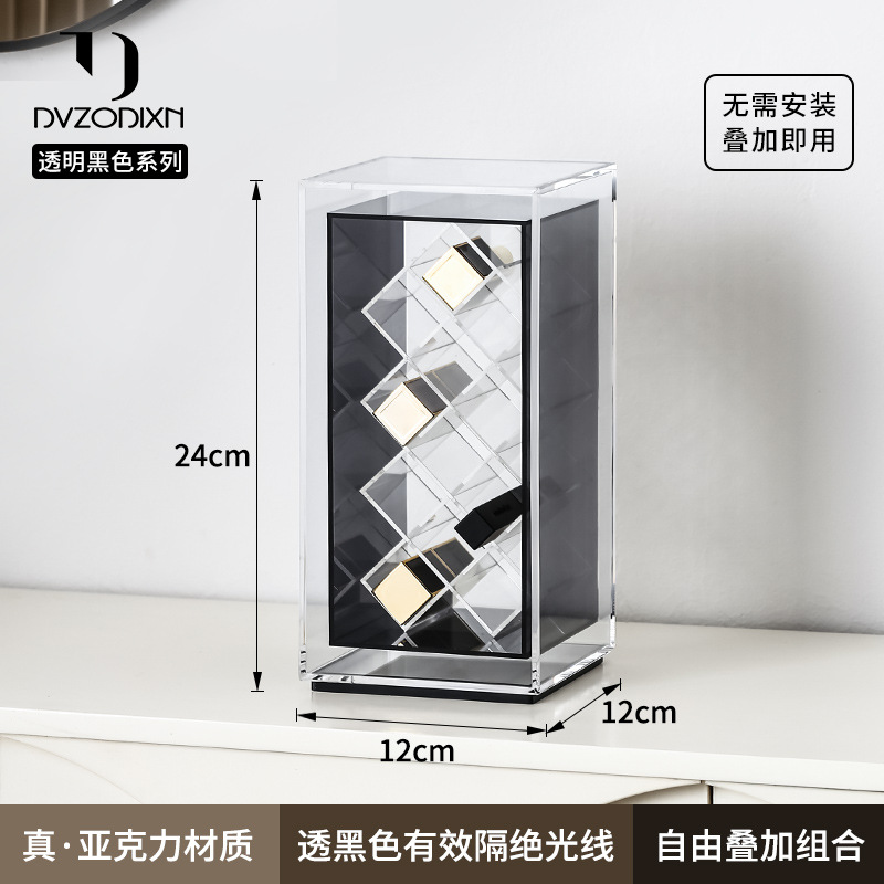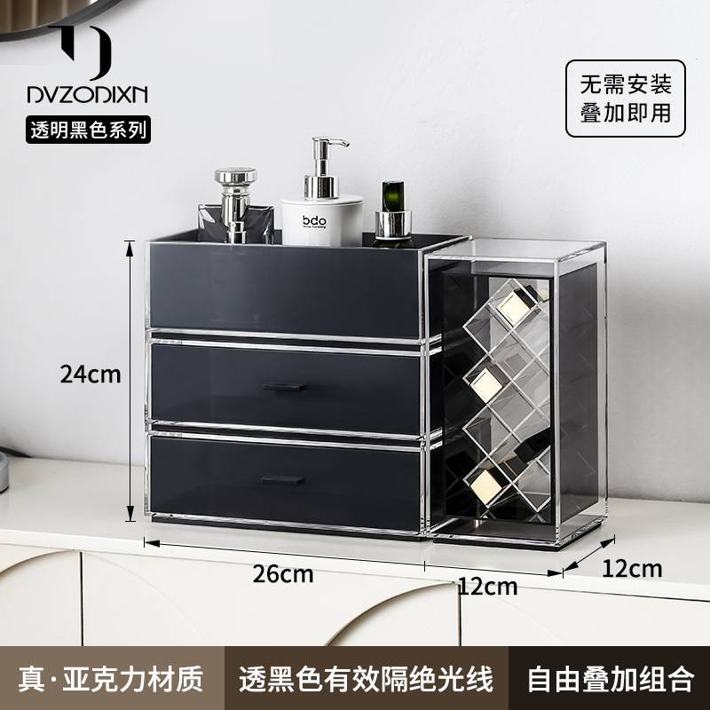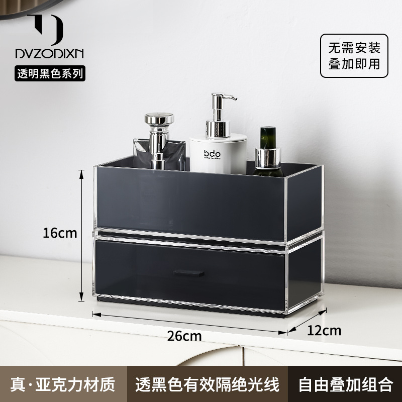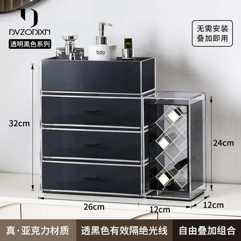 Главная страница > Черная акриловая косметическая коробка для хранения ящика с выдвижным ящиком с накладным столешком для туалетного столика с помадой для макияжа