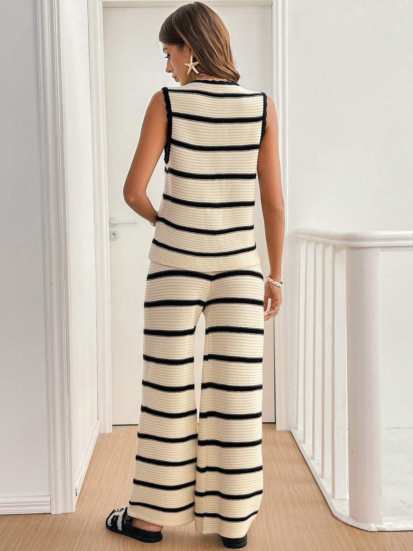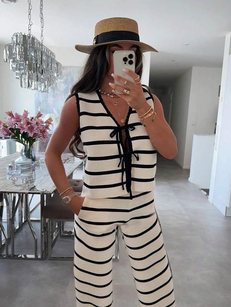 Главная страница > [В наличии] Трансграничный вязаный женский летний новый стиль, трикотажные брюки без рукавов со шнуровкой спереди, женский костюм