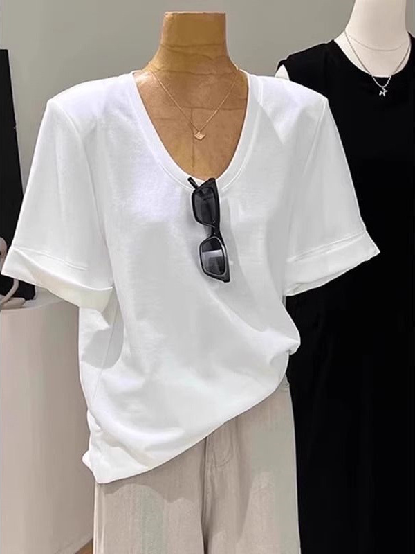 Хлопчатобумажная футболка с короткими рукавами наплечный рулон простой модный свободный корейский 2025 летний новый дизайн чувство U-образный топ