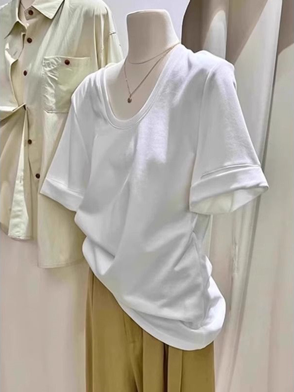Главная страница > Хлопчатобумажная футболка с короткими рукавами наплечный рулон простой модный свободный корейский 2025 летний новый дизайн чувство U-образный топ
