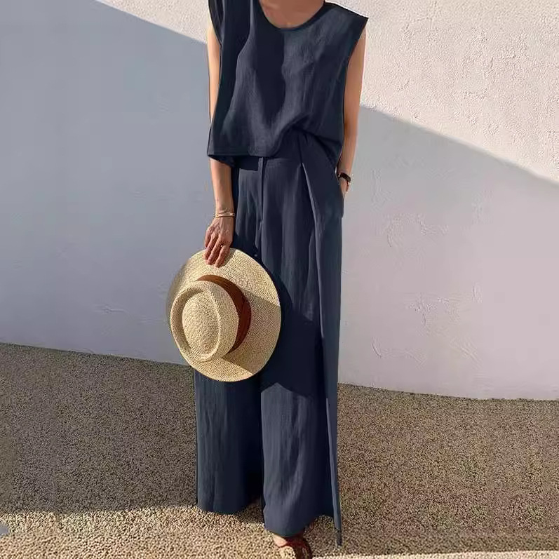 Главная страница > 2023 весна и лето новые хлопковые и льняные модные повседневные свободные два комплекта без рукавов свободные широкие брюки женские