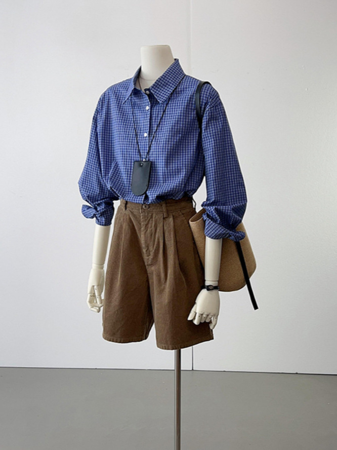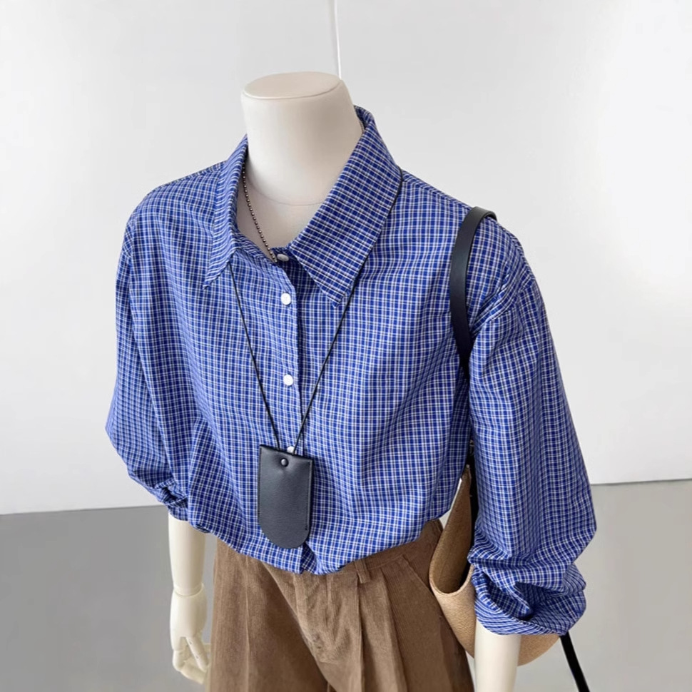 Главная страница > Рекомендуется на уровне CHAO! Это действительно выглядит хорошо ~ Корейская синяя клетчатая рубашка женская дикая свободная рубашка с лацканом