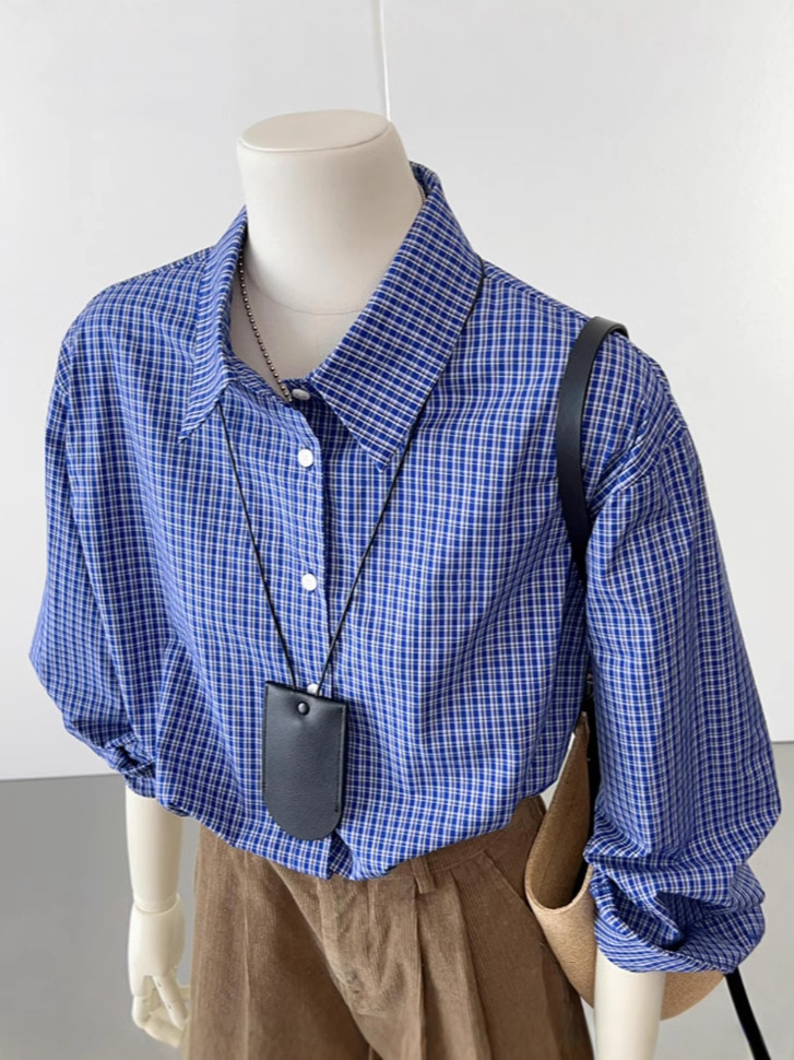 Рекомендуется на уровне CHAO! Это действительно выглядит хорошо ~ Корейская синяя клетчатая рубашка женская дикая свободная рубашка с лацканом