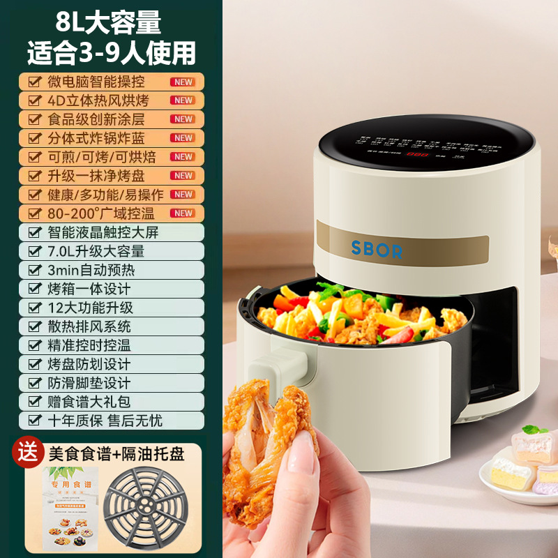 Верхняя часть объемом 8 л оснащена интеллектуальным сенсорным ЖК-экраном + отсутствие масляного дыма + сковорода с антипригарным покрытием + 360°°Циркуляция горячего воздуха