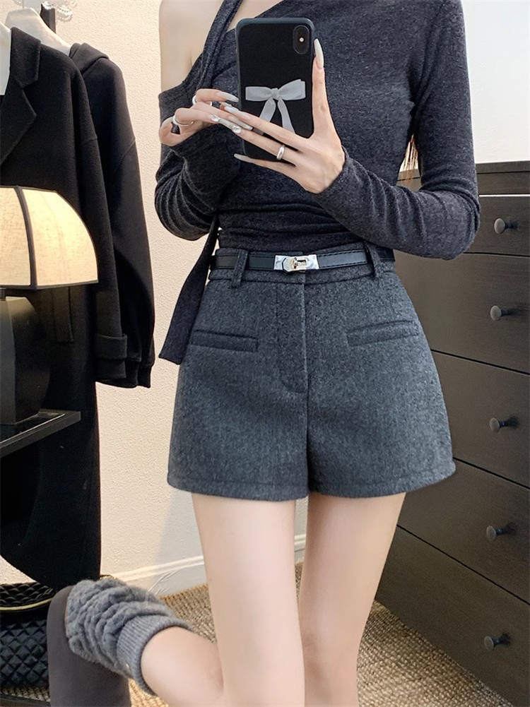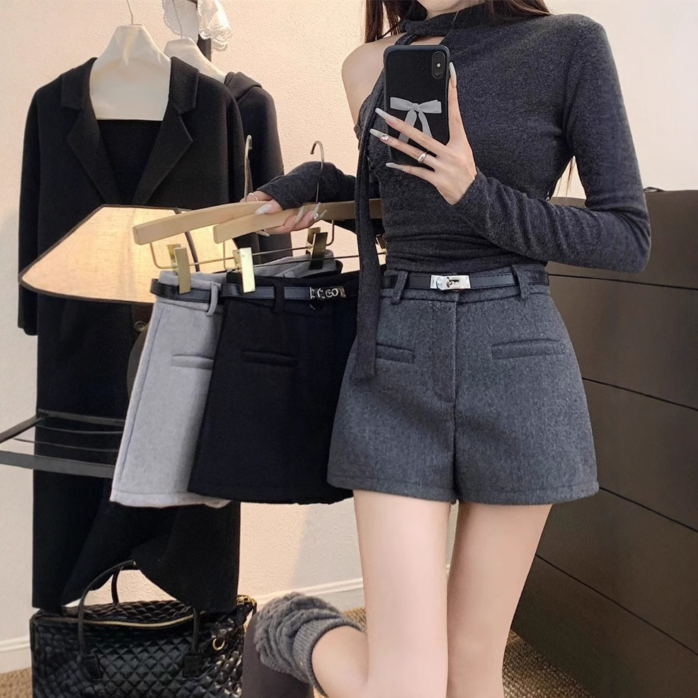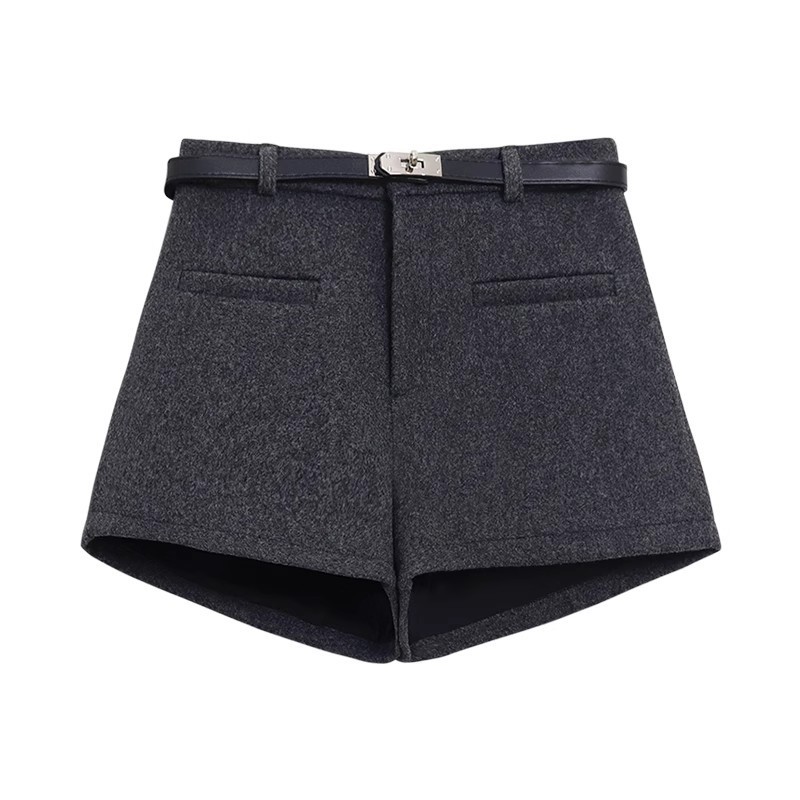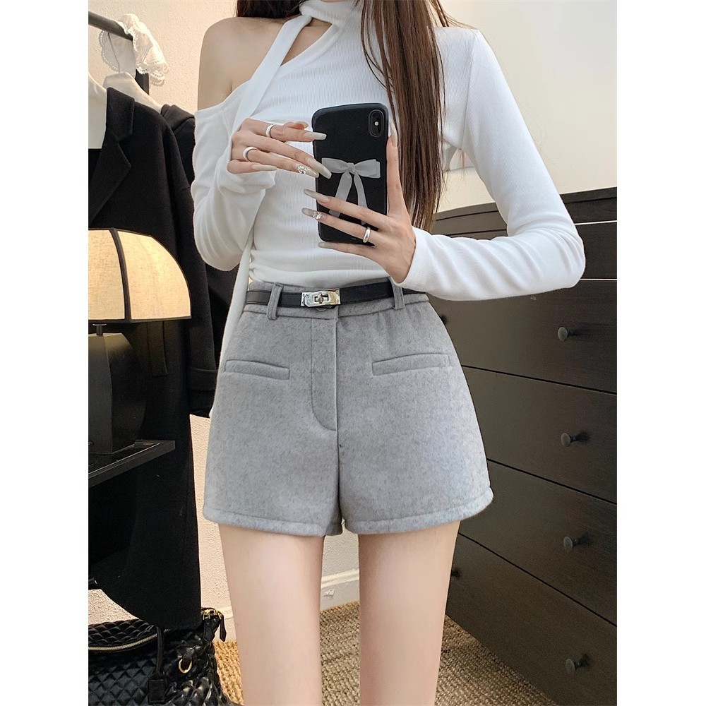 Главная страница > Горячая девушка сплошной цвет с высокой талией шерстяная шерстяная буква повседневные брюки осень-зима 2025 новая минималистская мода темперамент тонкая шорты женская